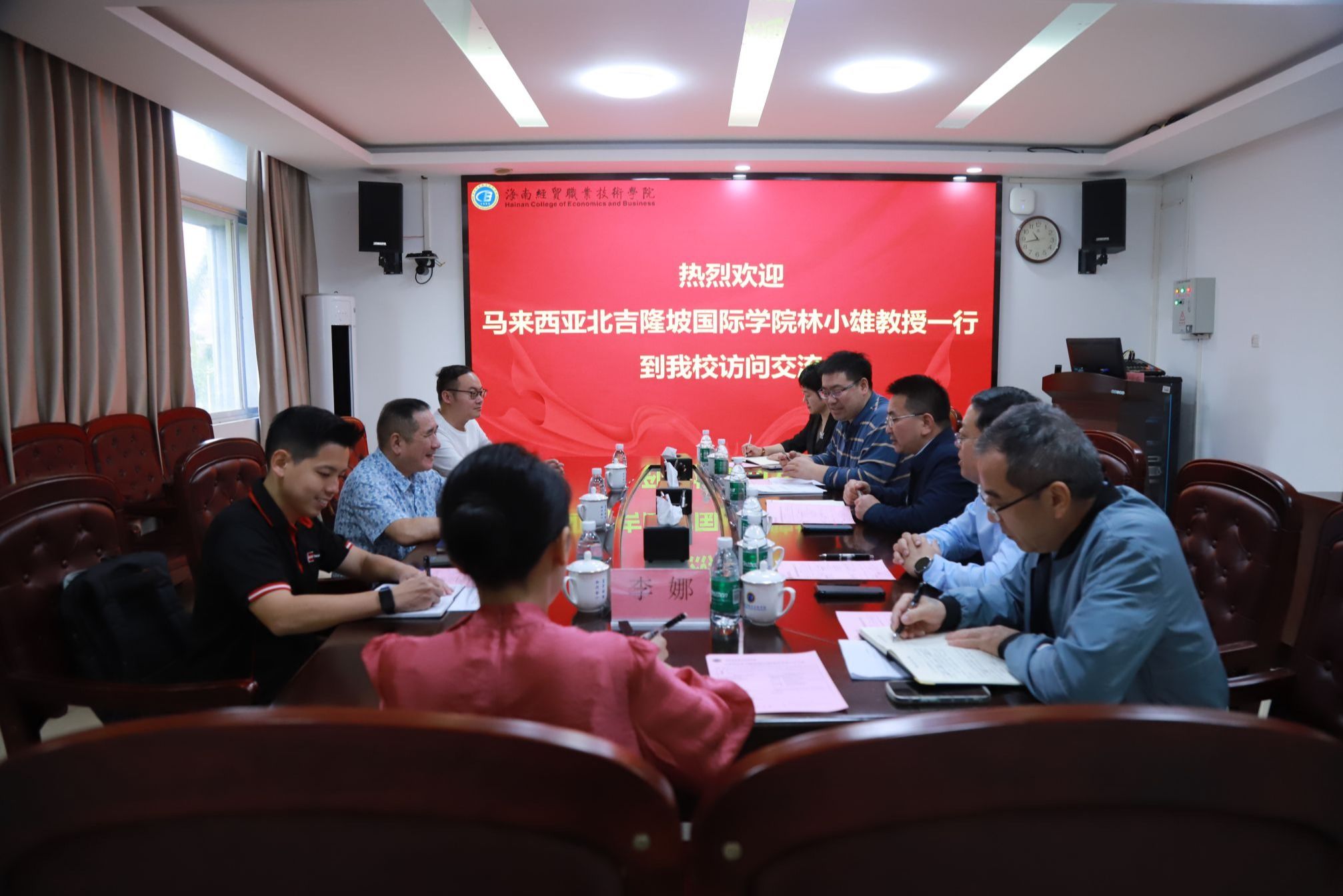 林小雄感谢海经贸的热情接待,他介绍了马来西亚人口概况、教育结构、北吉隆坡国际学院的基本情况。他说,在学生访学、语言培训、课程共建、国际教材编写与出版、学历晋升、项目合作、中马文化交流等方面,两校有很多合作空间,希望双方共同探索职业教育国际化合作新模式,助力两校高质量发展。