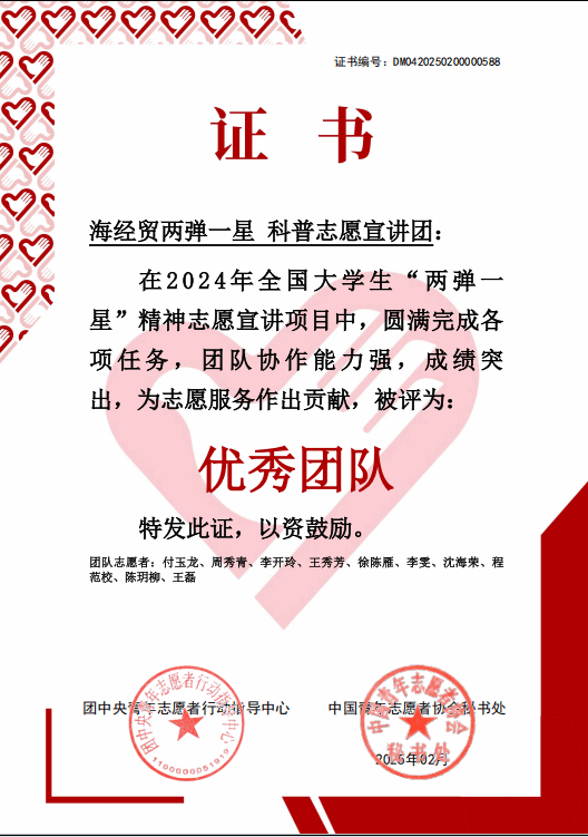 近日,团中央青年志愿者行动指导中心、中国青年志愿者协会秘书处评选出100支2024年全国大学生“两弹一星”精神志愿宣讲项目“优秀团队”。betway西汉姆联官网“两弹一星”精神科普志愿宣讲团精心筹备,充分发挥专业特色,圆满完成宣讲任务,在全国870所高校1000支团队中脱颖而出,获得“优秀团队”荣誉称号。