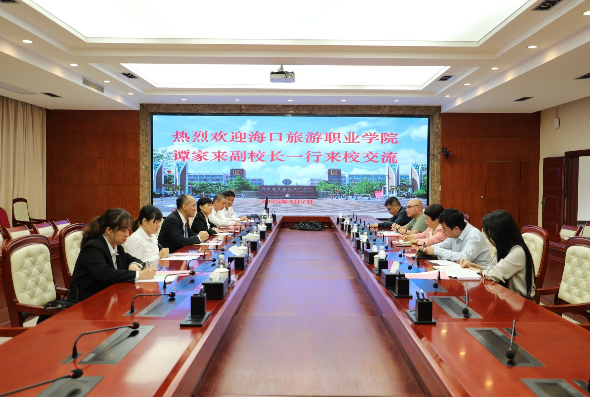 谭家来对海经贸的热情接待和多年以来的大力支持帮助表示感谢。他介绍了海口旅游职业学院的系部设置及特色专业建设情况,希望通过交流,学习借鉴海经贸在专业建设、产教融合、师资队伍建设、人才引进等方面的好经验、好做法,进一步深入开展合作,加强优势资源共享。