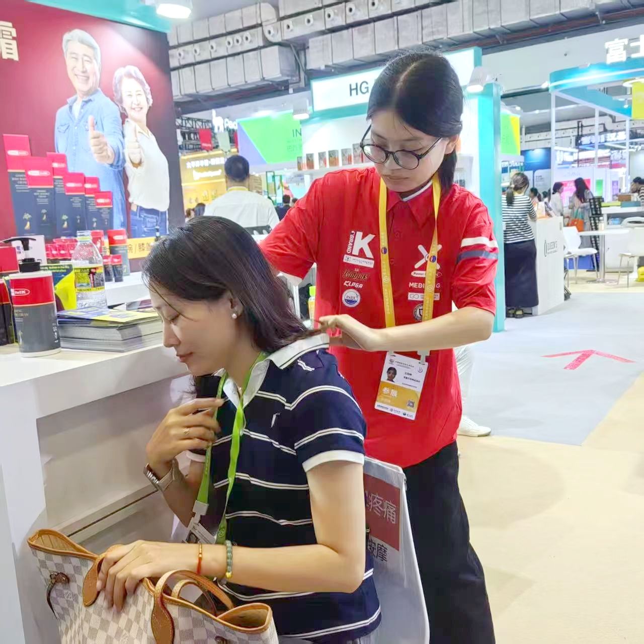 王佳楠同学在4号馆韩国宝富乐思株式会社展区提供志愿服务,向大家介绍韩国人参按摩霜。她积极推荐,向客人们展示产品并提供试用体验。“我的社交能力、韩语口语表达能力都得到了非常大的提升。”她说。