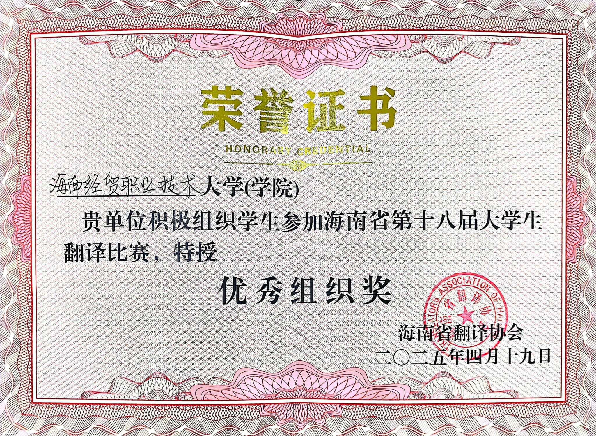 2025年4月19日,海南省第十八届大学生翻译比赛圆满落幕。betway西汉姆联官网参赛选手们凭借扎实的语言功底和精准的翻译技巧,荣获3个一等奖、2个二等奖、4个三等奖,学校获得“优秀组织奖”。
