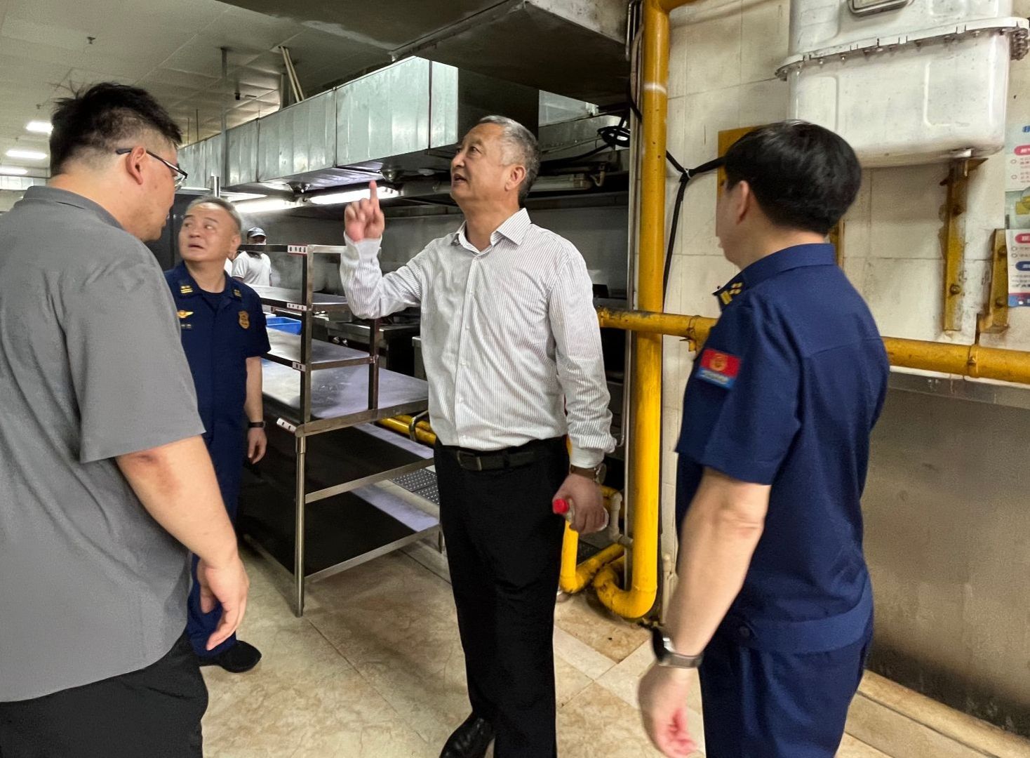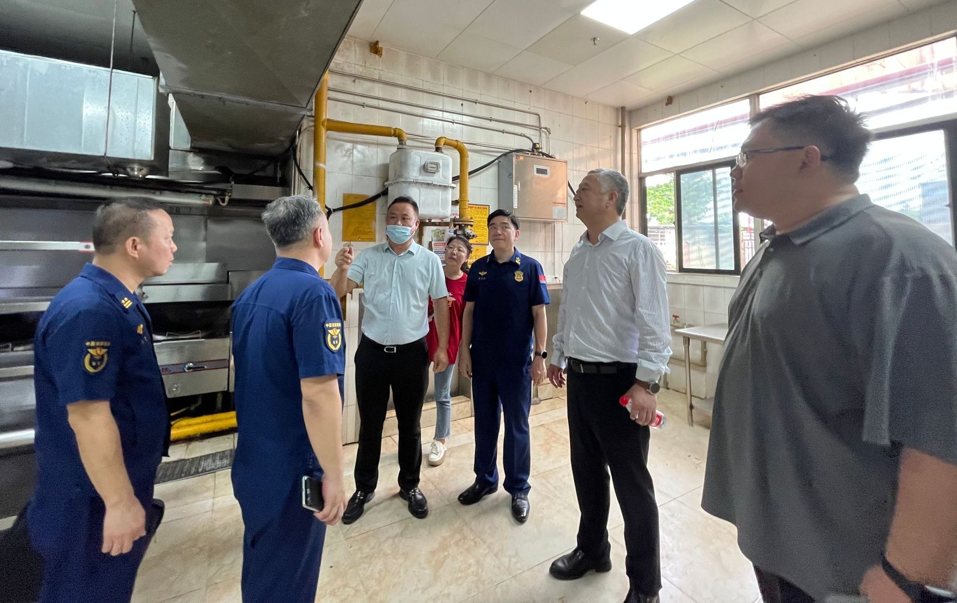 在学生食堂,李湖、雷进德深入检查疏散通道、安全出口是否保持畅通,应急照明、疏散指示标志是否配置齐全,消防设施器材是否完好有效,用火用电用气是否规范等:对发现的隐患问题,现场给予反馈并提出整改意见。