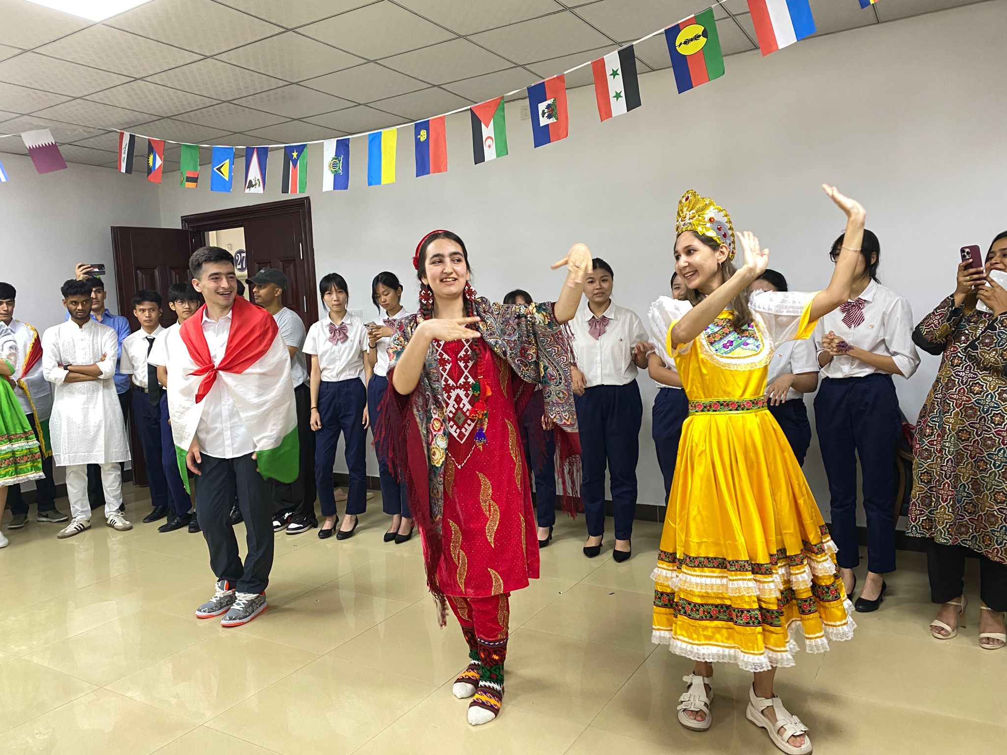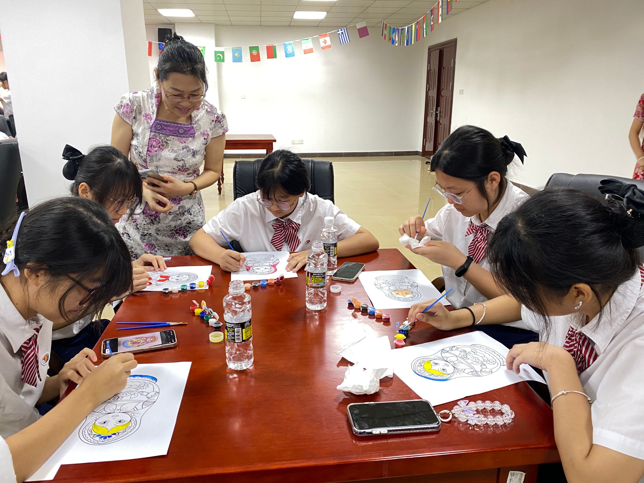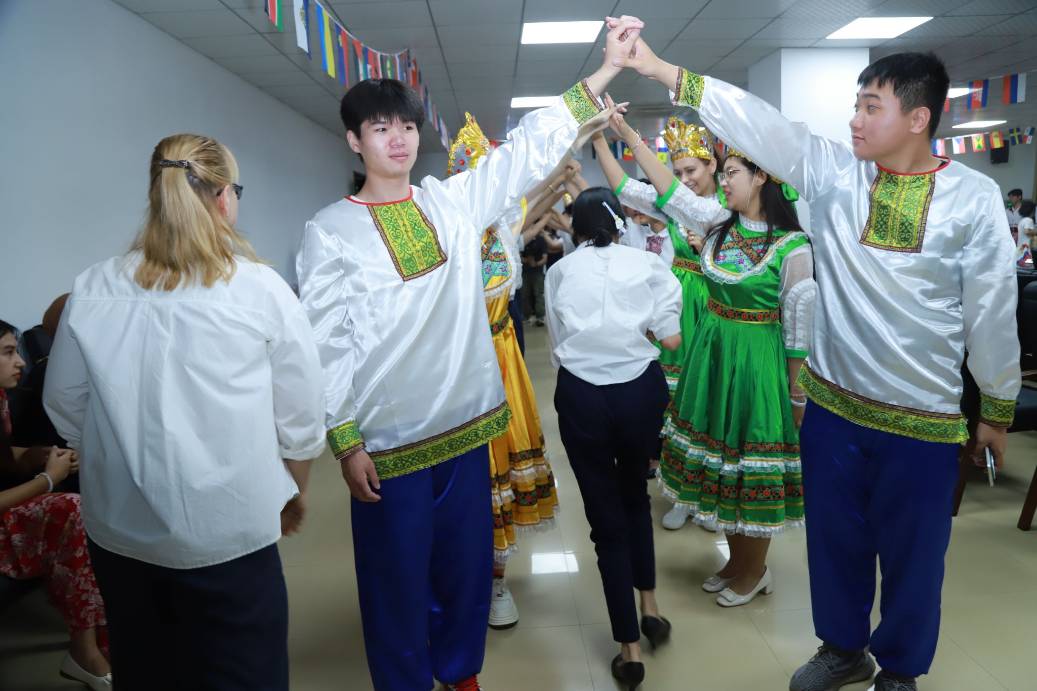 图书馆2楼会议室热闹非凡,国际教育学院、乌拉尔学院的外籍教师、国际汉语教师、中外学生与中职学校的学弟学妹们度过了一段难忘的上午时光。活动现场精彩纷呈,大家一同参与俄罗斯套娃彩绘,用画笔勾勒出独特的创意与色彩;塔吉克斯坦和巴基斯坦的国际学生带来了充满异域风情的舞蹈表演,灵动的身姿、欢快的节奏瞬间点燃了现场的气氛;趣味十足的游戏互动环节,让参与者们笑声不断、情感升温。大家还饶有兴致地学习用各国语言说出“我们是朋友”,感受不同语言背后的文化魅力。