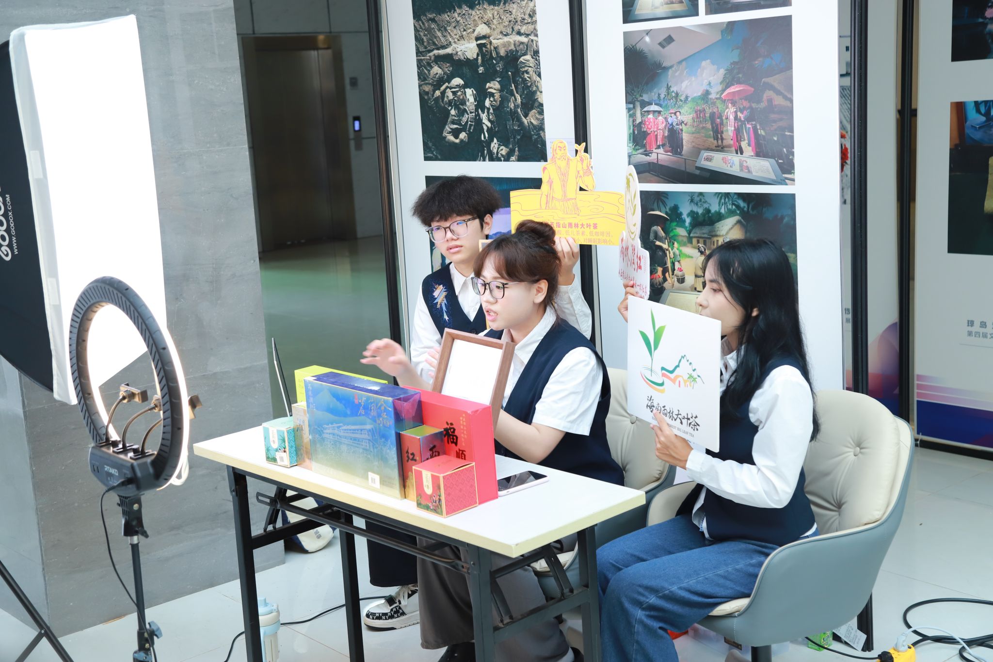 “欢迎光临我们的直播间,这款海南五指山绿茶茶汤颜色清冽,回味甘甜,无论是自用还是送礼,都非常不错哦!”熊子青等同学在聚光灯前模拟网络直播销售,向大家介绍海南产品。