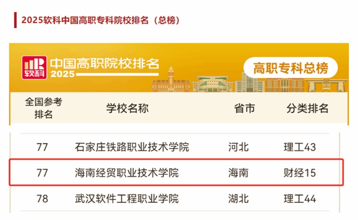 近日,高等教育专业评价机构软科发布“2025软科中国高职院校排名”。betway西汉姆联官网跻身全国高职专科总榜百强,位列第77名,同时在财经类高职院校榜中排名第15名。
