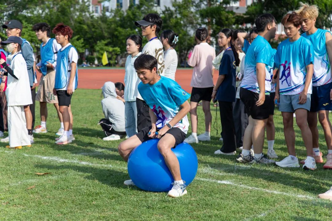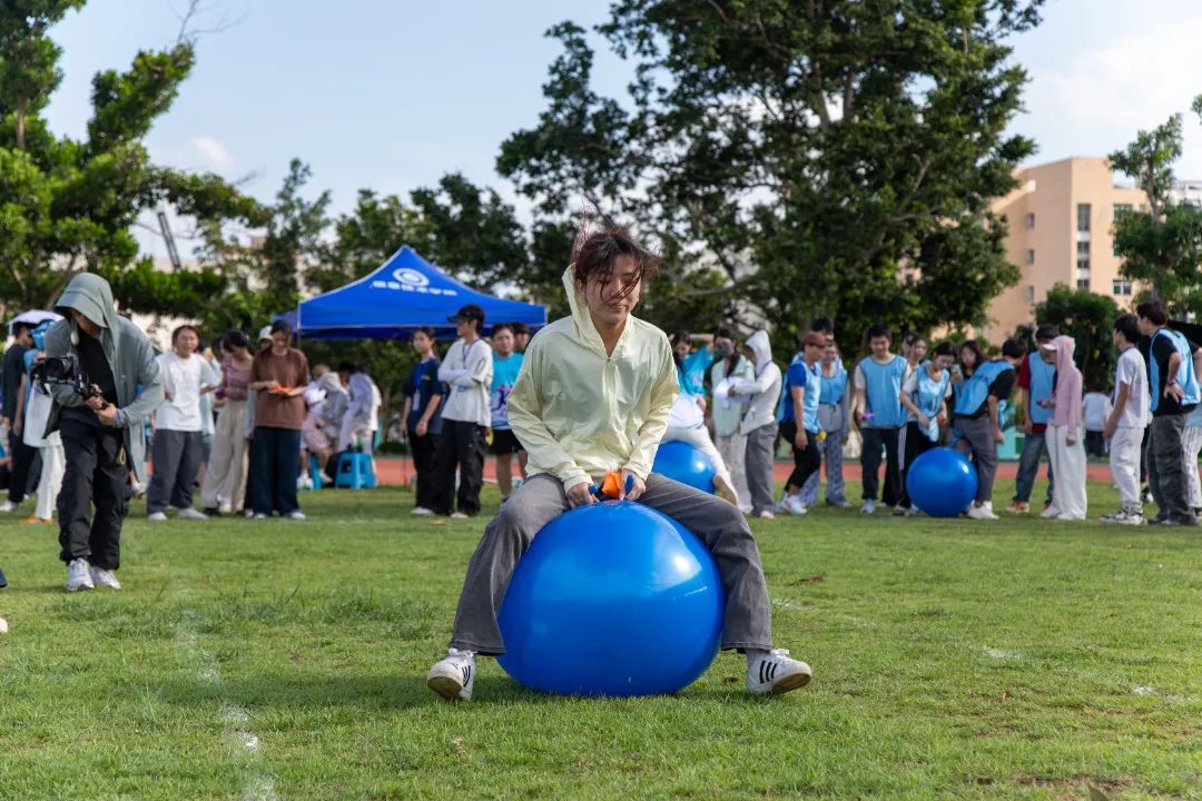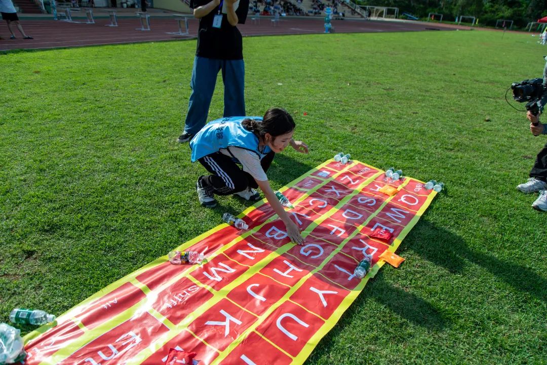 信息技术学院的“键盘字母接力赛”项目模拟计算机键盘的使用原理。各参赛队员随机抽取一张英文句子卡,在短时间内精准记住字母顺序,随后骑着瑜伽球,将标号沙包依次准确放置到键盘模型上与句子字母对应的位置。整个过程要求队员们眼疾手快、思维敏捷,在完成具象化任务的同时,将计算机学科的核心能力融入物理互动之中。