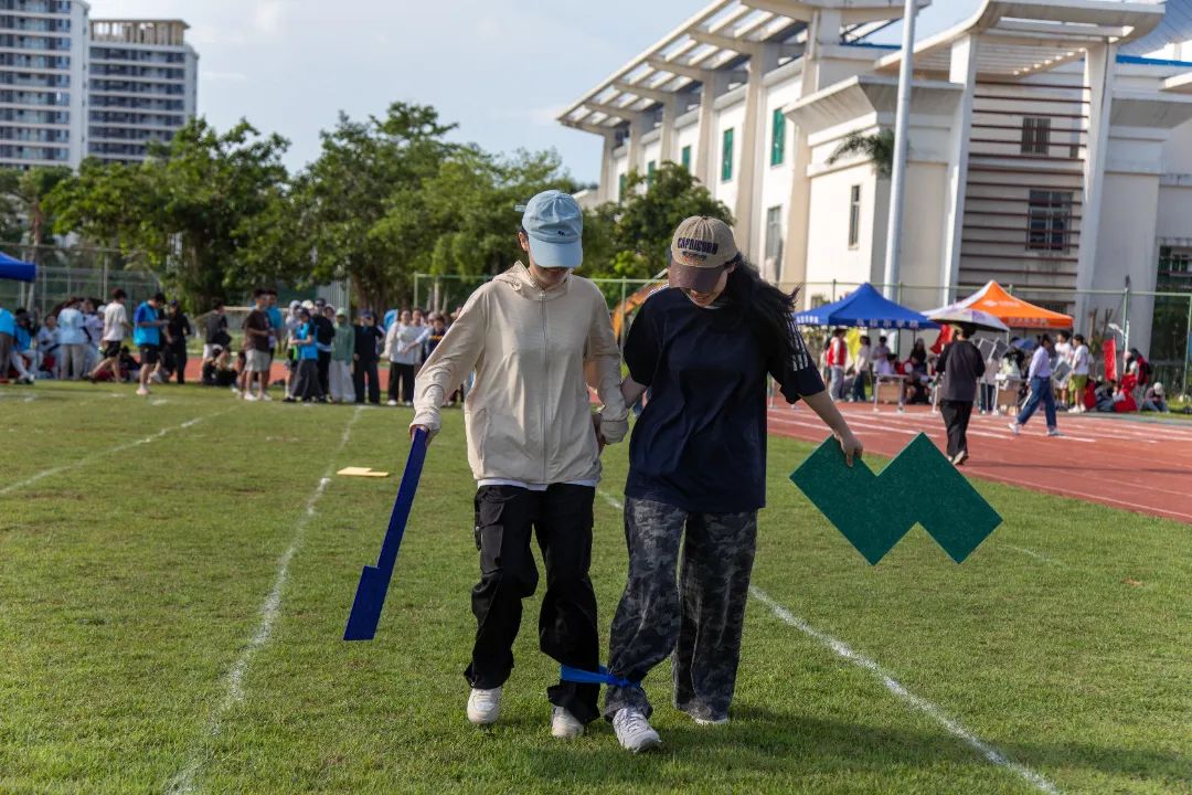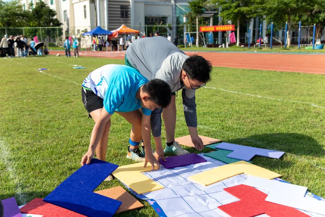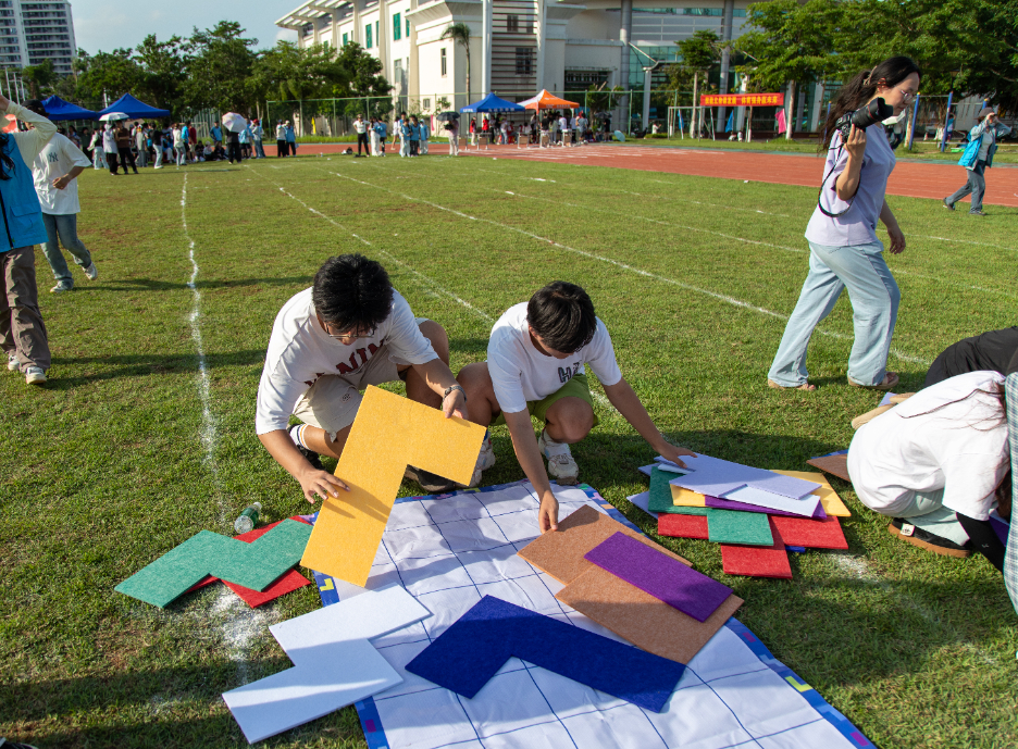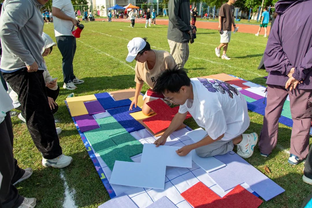 “绑腿的位置要结实一些,这样我们动作才能更统一。”人文艺术学院的“画布拼贴挑战赛”项目以艺术设计专业图形与色彩基础搭配设计知识为核心出发点,巧妙融合体育竞技元素,充分调动参与者的视觉感官体验。在比赛现场,参赛队员们以“二人三足”的形式沿着指定路线前行。行进途中,他们需精准拿取拼图毡板道具,随后抵达终点处,凭借对图形与色彩的理解和搭配能力进行拼图作业。完成一组拼图后,下一组队员接力重复上述动作,直至最终完成整张拼图。