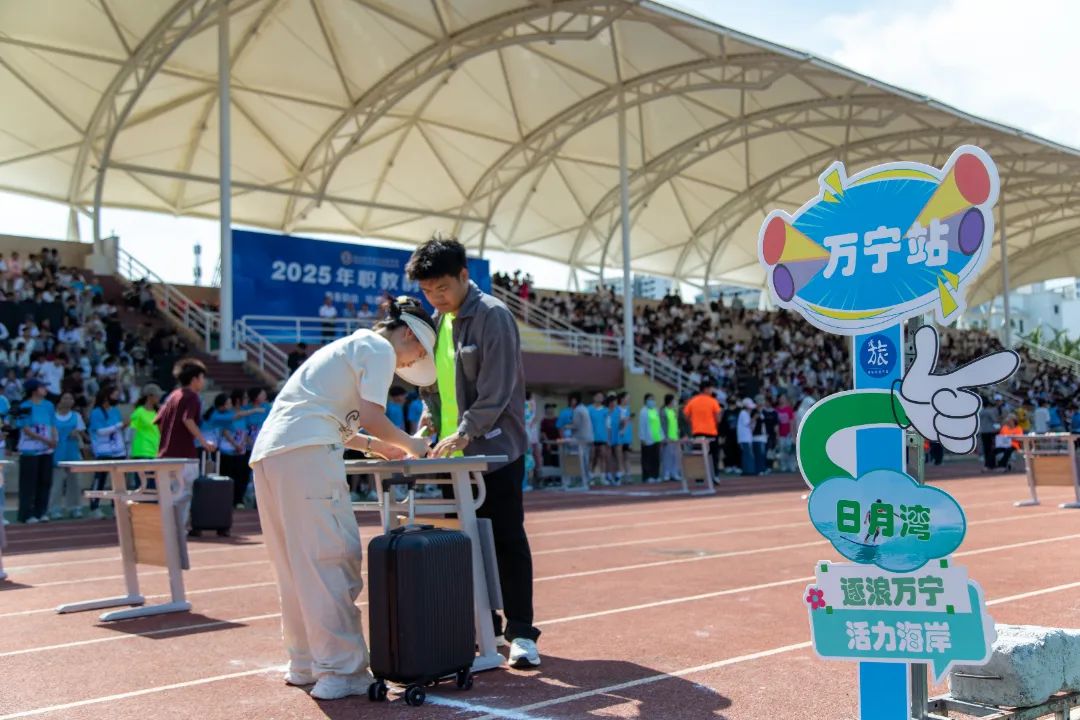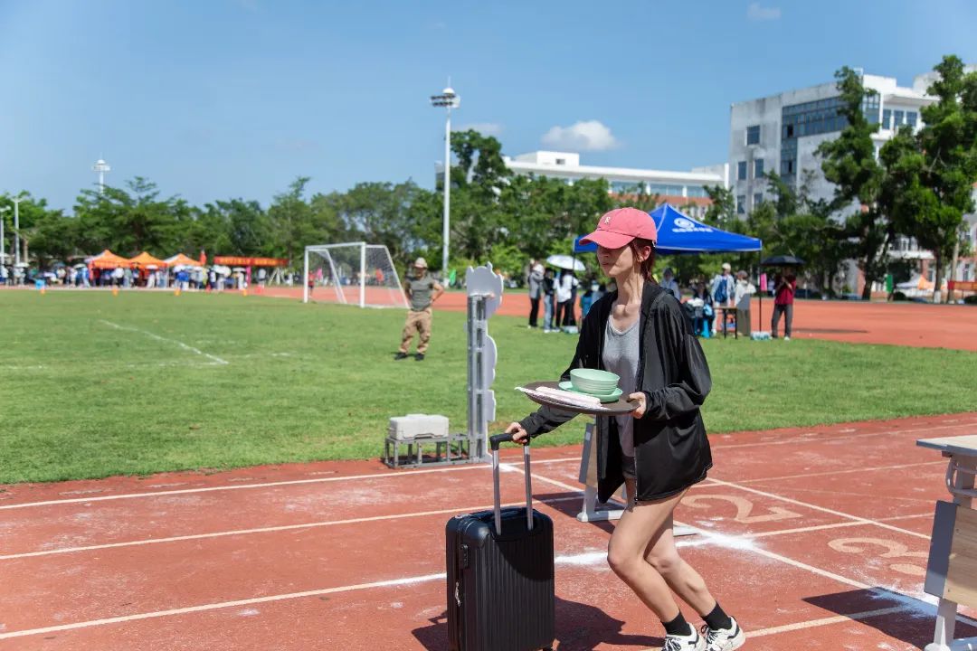 国际旅游学院的“‘旅’行万里”项目整合了餐饮服务、烹饪技能、旅游知识、营销技巧、团队协作等关键技能,模拟了真实的旅游服务场景。参赛队员们完成“推动行李箱”“整理叠叠杯”“锅勺舀出乒乓球”“擀面杖制作圆形饺子皮”等指定动作,通过“海口站”“文昌站”“万宁站”等海南东线的各站点关卡。“稳一点,物品掉落要加时!”队员之间出谋划策、加油助威,趣味十足。