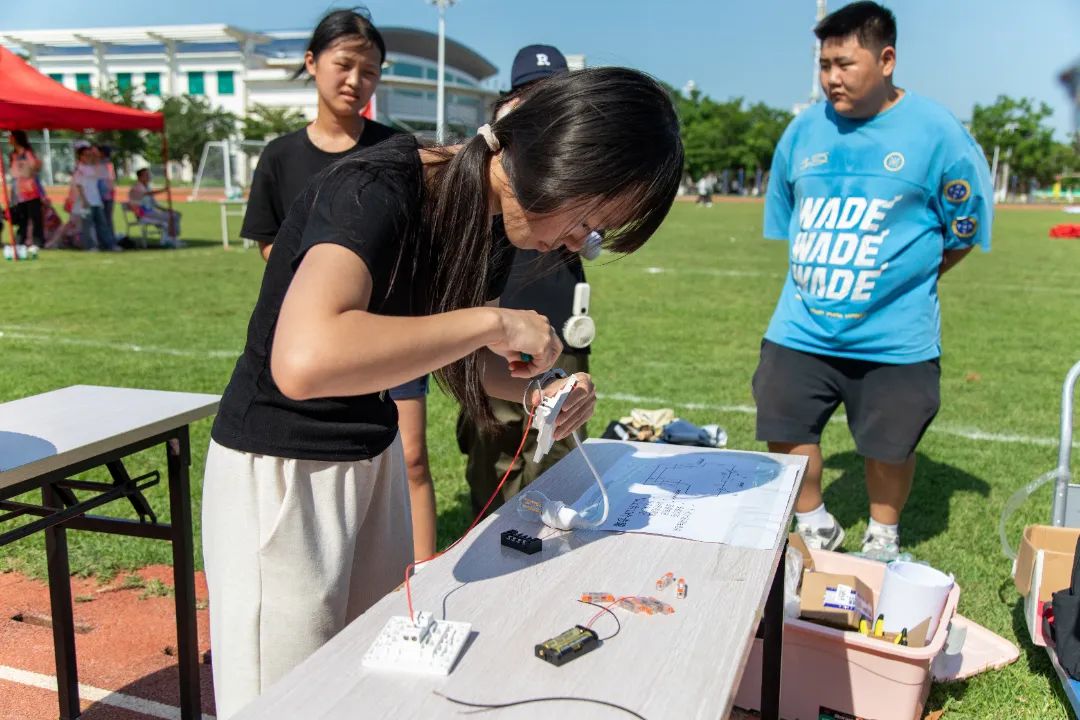 机电与汽车工程技术学院带来了“‘小小工程师’接力大闯关”项目。该项目源自汽车检测与维修专业的教学实践,模拟更换轮胎及接线路板的实际场景。在比赛过程中,参赛队员们先将轮胎滚动至指定地点,拿起电路图,完成灯泡点亮任务,又马不停蹄地将轮胎滚回起跑线,如此循环往复,直至所有队员完成比赛。最终,以用时最少的队伍为获胜方。