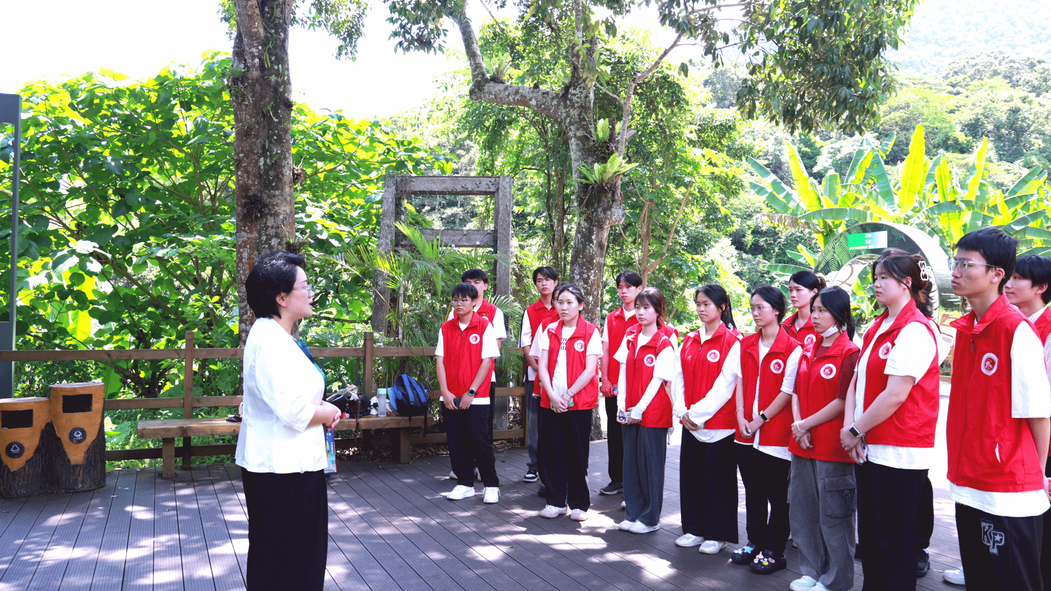 揭牌仪式结束后,海经贸思政课教师孙雪丽以“走进热带雨林,感悟生态之美”为主题,结合热带雨林国家公园五指山片区的实际情况,从生态保护、文化传承、社会责任等多个维度,在雨林广场为同学们讲授了一堂生动的“行走的思政课”。