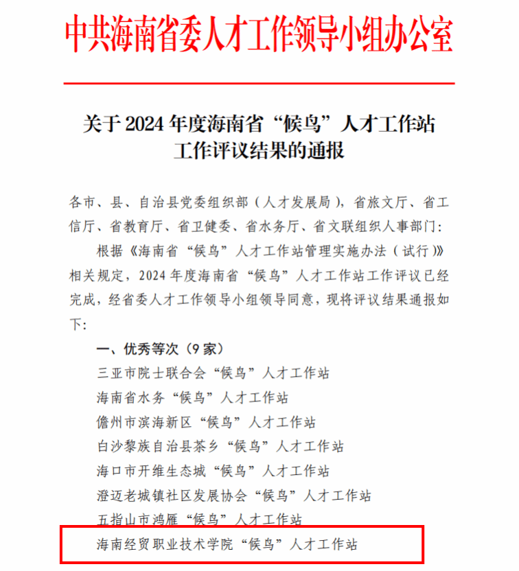 近日,中共海南省委人才工作领导小组办公室公布2024年度海南省“候鸟”人才工作站工作评议结果,betway西汉姆联官网再次以优秀等次通过评议。
