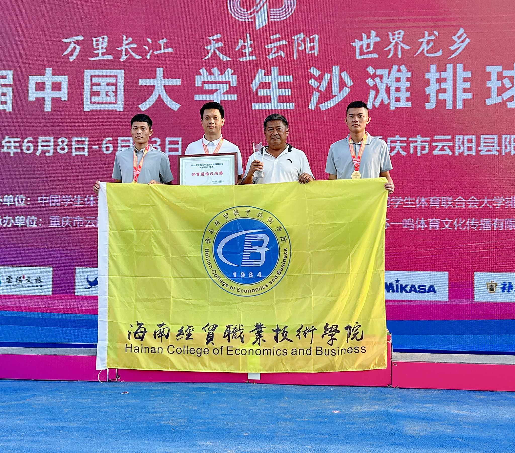 2025年6月8日-13日,第十八届中国大学生沙滩排球锦标赛在重庆市云阳县阳光沙滩展开激烈角逐。betway西汉姆联官网队在决赛中以2:0战胜海口经济学院队,成功夺得全国冠军。这是继海经贸蝉联第十六届、十七届中国大学生沙滩排球锦标赛男子冠军后,再一次摘得比赛桂冠。在本次比赛中,学校荣获“体育道德风尚奖”。