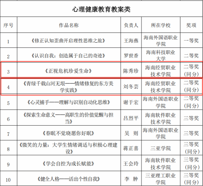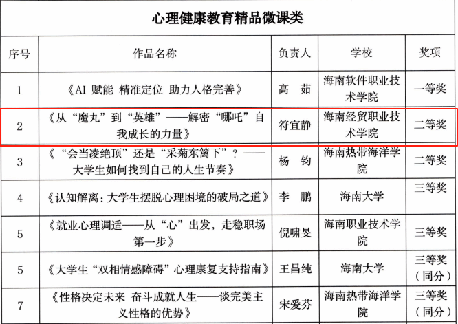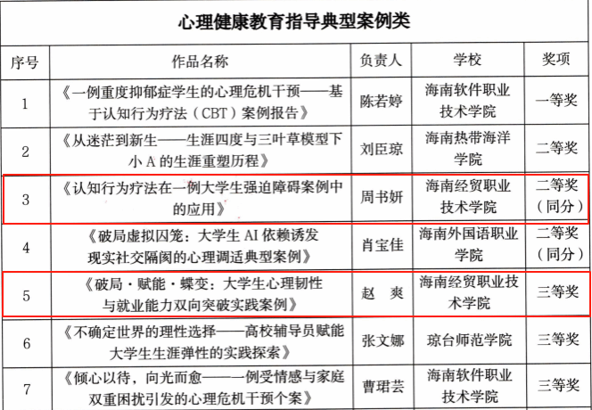 近日,2025年全省高校心理育人“五个一批”系列评选活动获奖作品公布。betway西汉姆联官网选送的作品《认知行为疗法在一例大学生强迫障碍案例中的应用》《从“魔丸”到“英雄”——解密“哪吒”自我成长的力量》《青绿千载山河无垠——情绪修复的东方美学实践》《正视危机 珍爱生命》分别获得心理健康教育指导案例类、微课类、教案类二等奖;《破局 ·赋能 ·蝶变:大学生心理韧性与就业能力双向突破实践案例》获得案例类三等奖。betway西汉姆联官网荣获“优秀组织单位奖”。