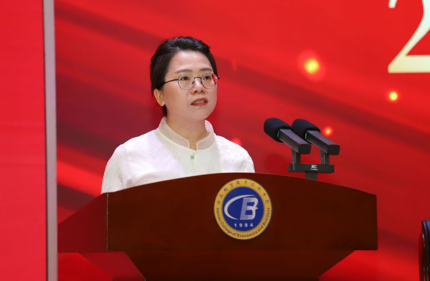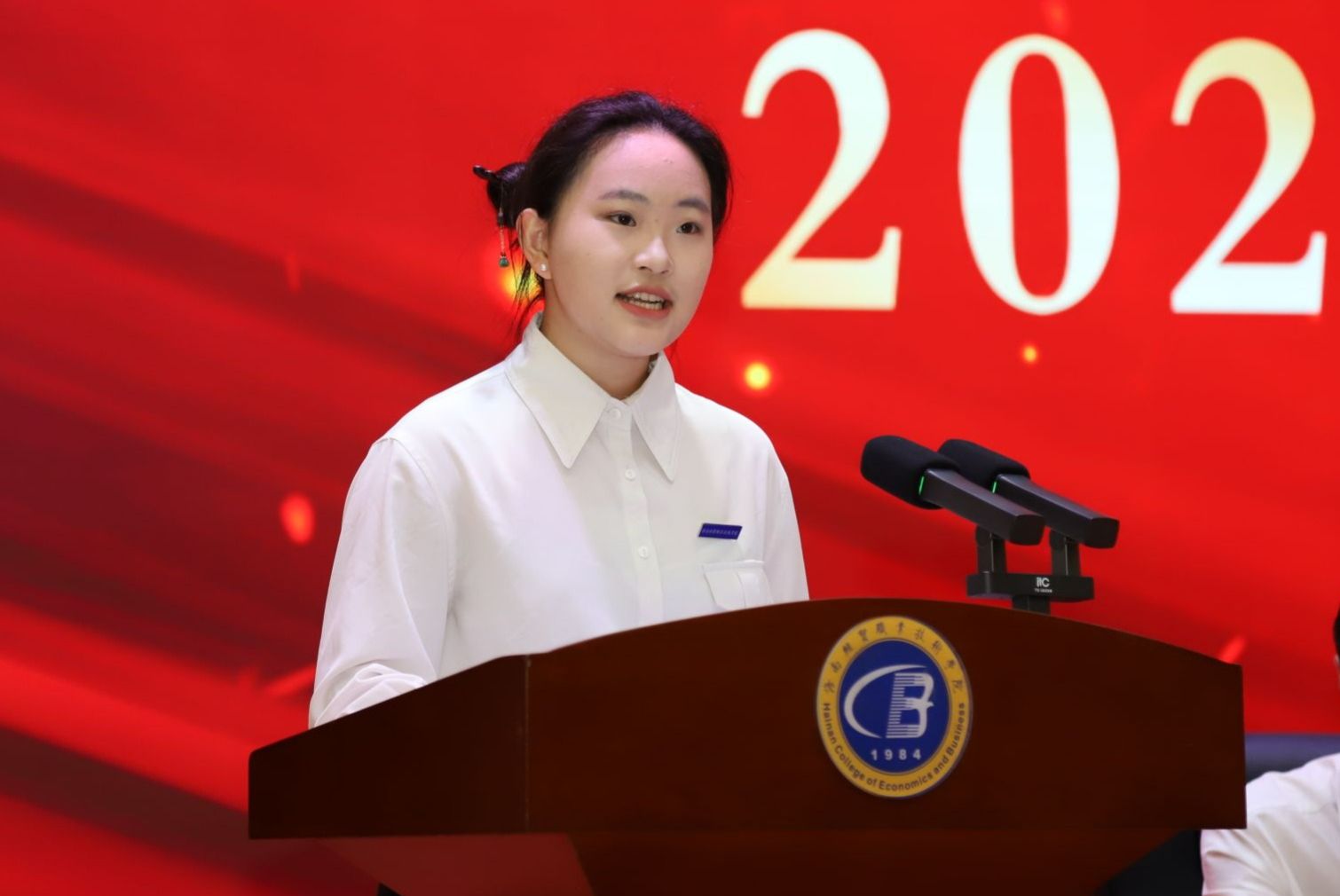 毕业生家长代表廖坎对辛勤耕耘、默默奉献的老师们致以最诚挚的感谢。他说,当看到孩子们从不知所措的新生蜕变为有追求、有思考、有担当的青年时,内心无比骄傲。希望孩子们牢记学校的培养,踏实做人、认真做事,海经贸越办越好,培养更多优秀人才。