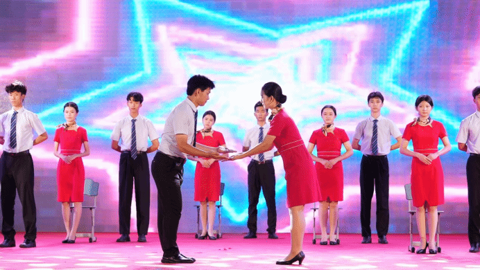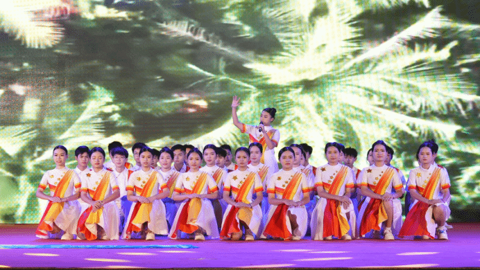 在“自贸新篇”篇中,海南省商业学校的同学以饱满的热情带来诗朗诵《潮起海之南》,让观众真切感受到海南改革开放浪潮中取得的发展奇迹。海口旅游职业学院带来舞蹈《“礼”好 自贸港》,同学们用舒展的肢体诠释千年礼仪之美,用跃动的节拍奏响自贸港的开放之音。《黎韵竹音》将本场展演推向了最高潮,海经贸的同学们身着多姿多彩的黎族服饰,跳起了别具风韵的竹竿舞,传达出青年一代对非遗文化传承和保护的热情和信心。