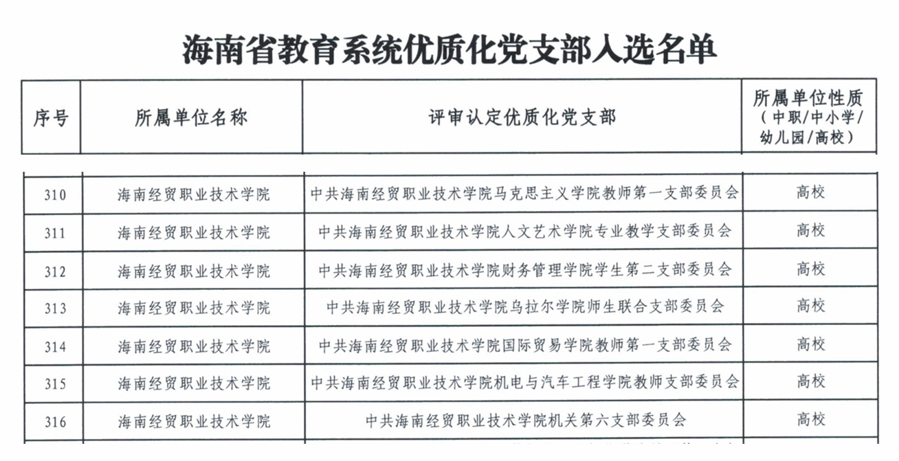 近日,中共海南省委教育工作委员会公布全省教育系统优质化党支部入选名单。betway西汉姆联官网马克思主义学院教师第一党支部、人文艺术学院专业教学党支部、财务管理学院学生第二党支部、乌拉尔学院师生联合党支部、国际贸易学院教师第一党支部、机电与汽车工程学院教师党支部、机关第六党支部等7个党支部成功入选。