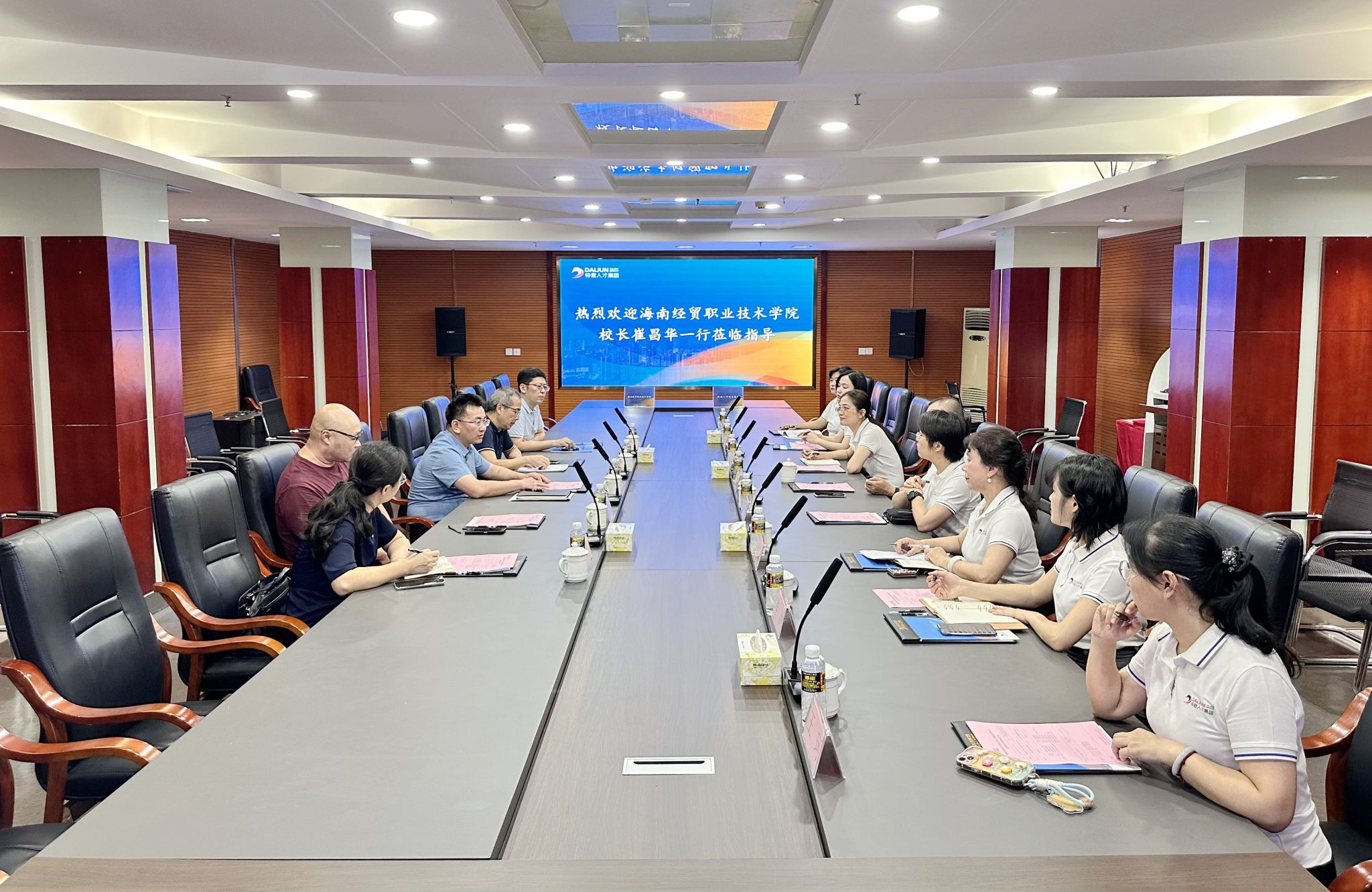 海经贸一行在待君人才集团管理层的陪同下,参观了集团总部,深入了解其发展历程、业务布局及企业文化。座谈会上,双方就当前海南自贸港背景下的人才需求趋势、高校人才培养与企业用人实践的精准对接、共建实习实训基地、联合开展职业技能培训与认定、探索“互联网+人力资源”服务新模式等议题展开了深入探讨,达成了广泛共识。