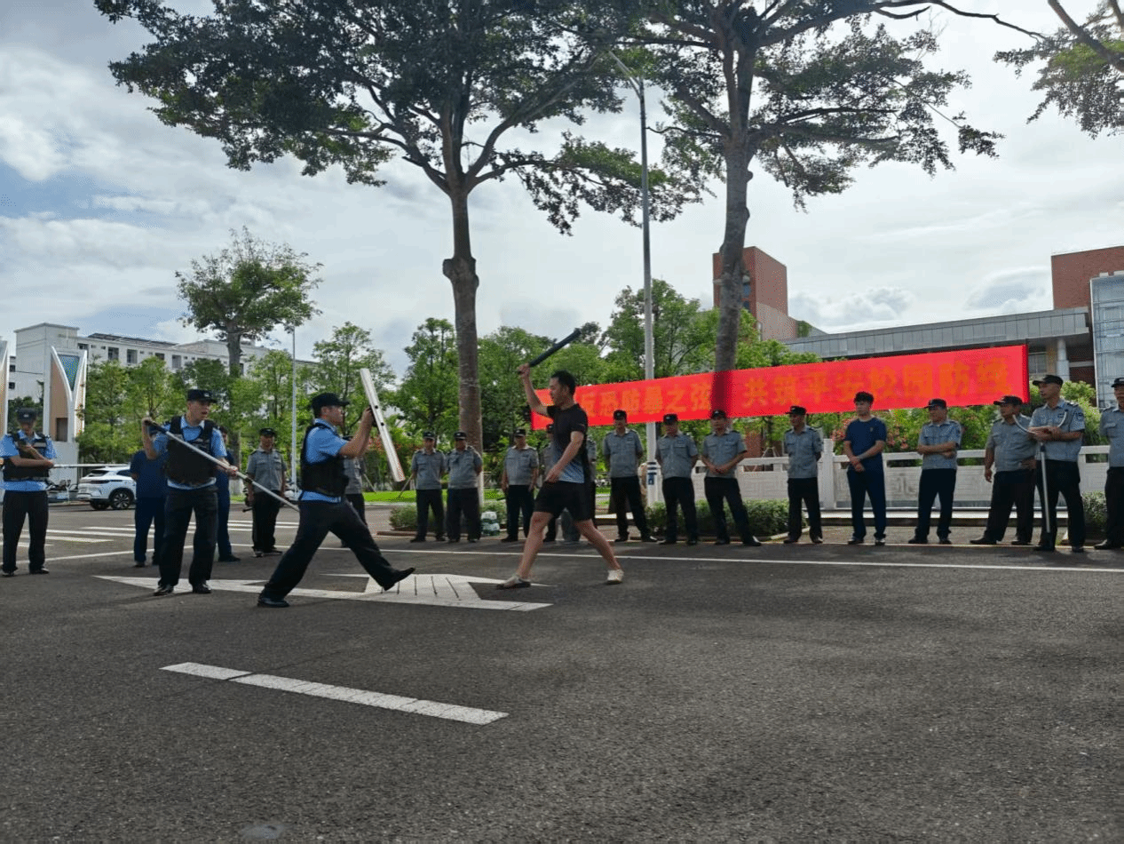 在实操环节,一名由安保人员扮演的 “歹徒” 持凶器试图闯入校园。安保人员发现后迅速启动应急预案,组成防暴处置小组,手持器材形成防御队形抵挡攻击,最终成功制服 “歹徒”。整个过程紧张有序,安保人员反应迅速、操作规范。