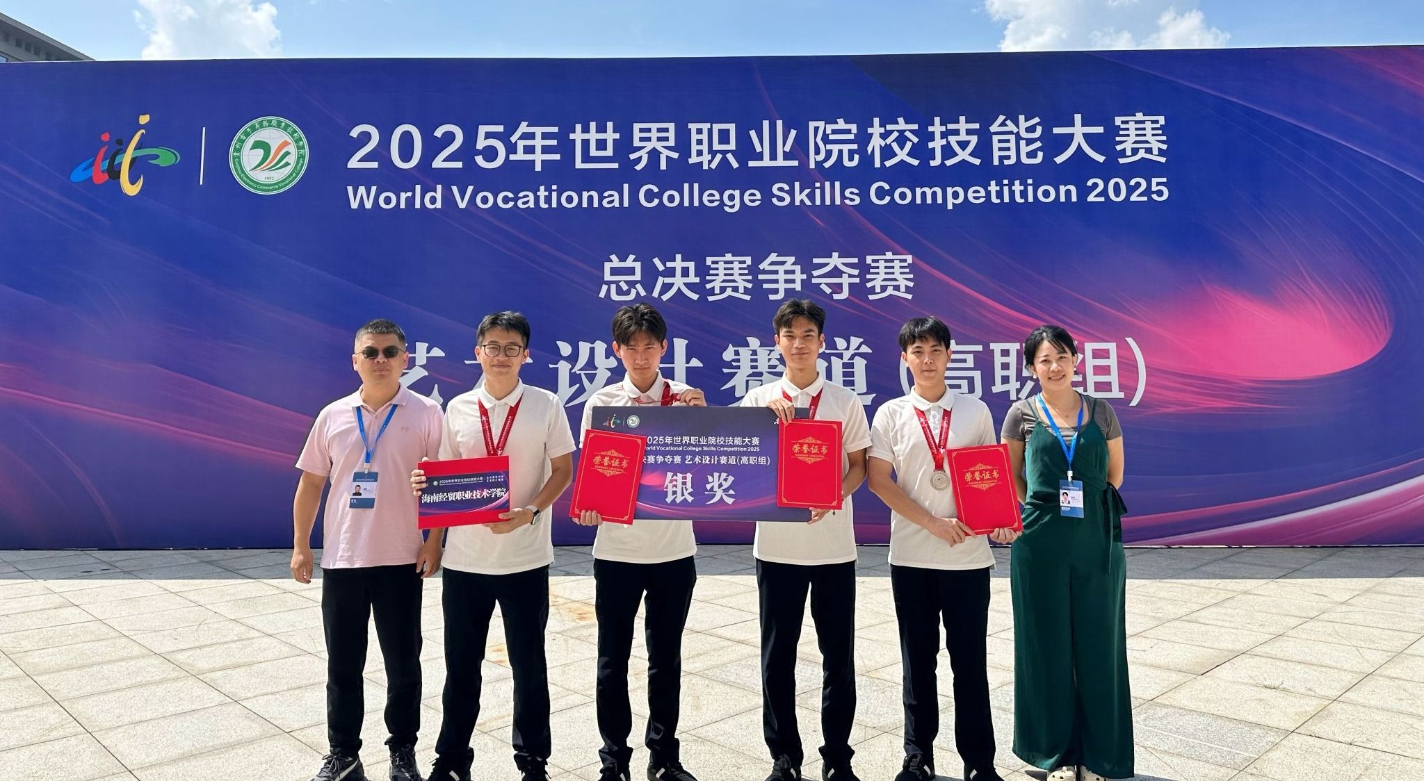 艺术设计赛道在贵州举行,来自全国各省市区的200多支代表队同台竞技,包含视觉艺术设计、环境艺术设计、产品设计、数字媒体艺术、手工艺设计等多个设计类专业参赛。在人文艺术学院刘首含、胡晓两位老师的悉心指导下,林良腾、邱天诚、梁正树、陈业扬等同学组成的参赛队全力拼搏,展现了扎实的理论基础和优秀实操技能,荣获银奖。