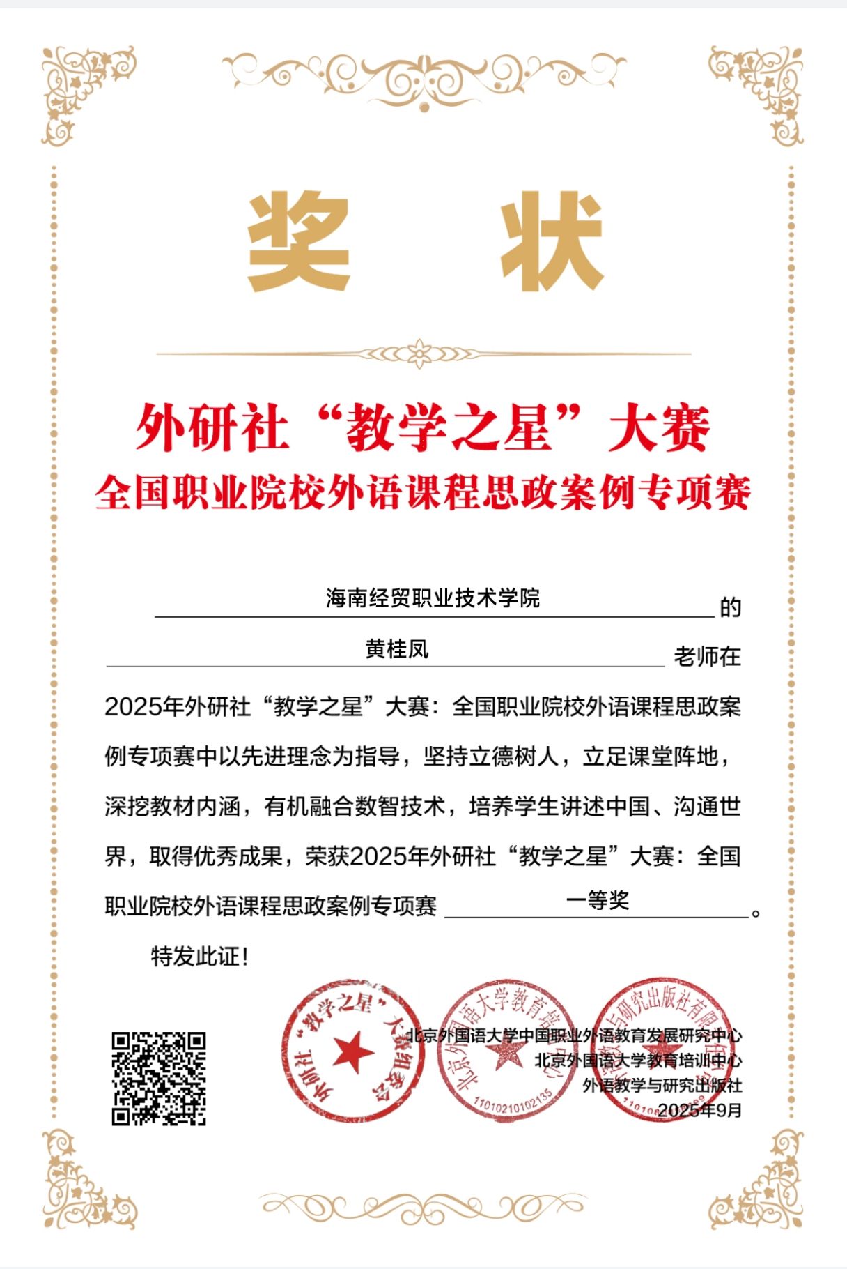 近日,2025年外研社“教学之星”大赛全国职业院校外语课程思政案例专项赛圆满结束。betway西汉姆联官网外国语学院教师黄桂凤的参赛作品 《新视野商务英语综合教程.1(第二版)“第一单元:公司介绍”荣获高职英语组一等奖。