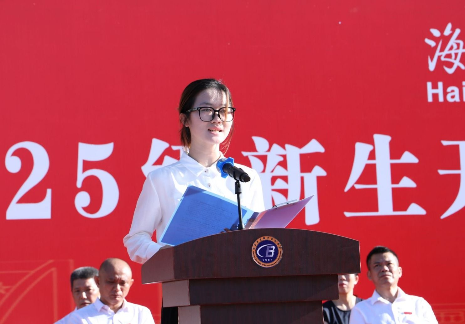 2025级国际贸易学院周若彤作为新生代表发言。她讲述了自己报考海经贸的坚定选择,表达对学校快速发展的光明前景及自我成长的满心期待。她说,大学是自我投资、自我成就的关键阶段,自己将紧跟时代,培养扎实的专业能力和良好的职业素养,用奋斗书写青春的答案。