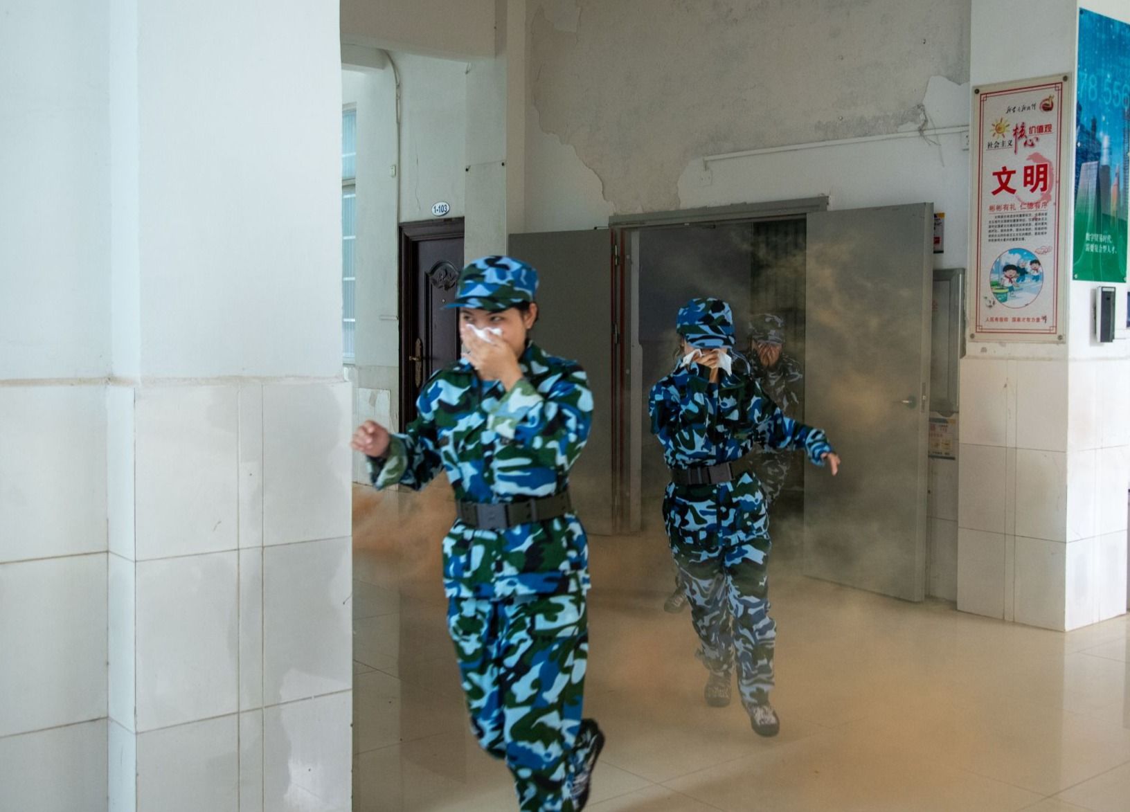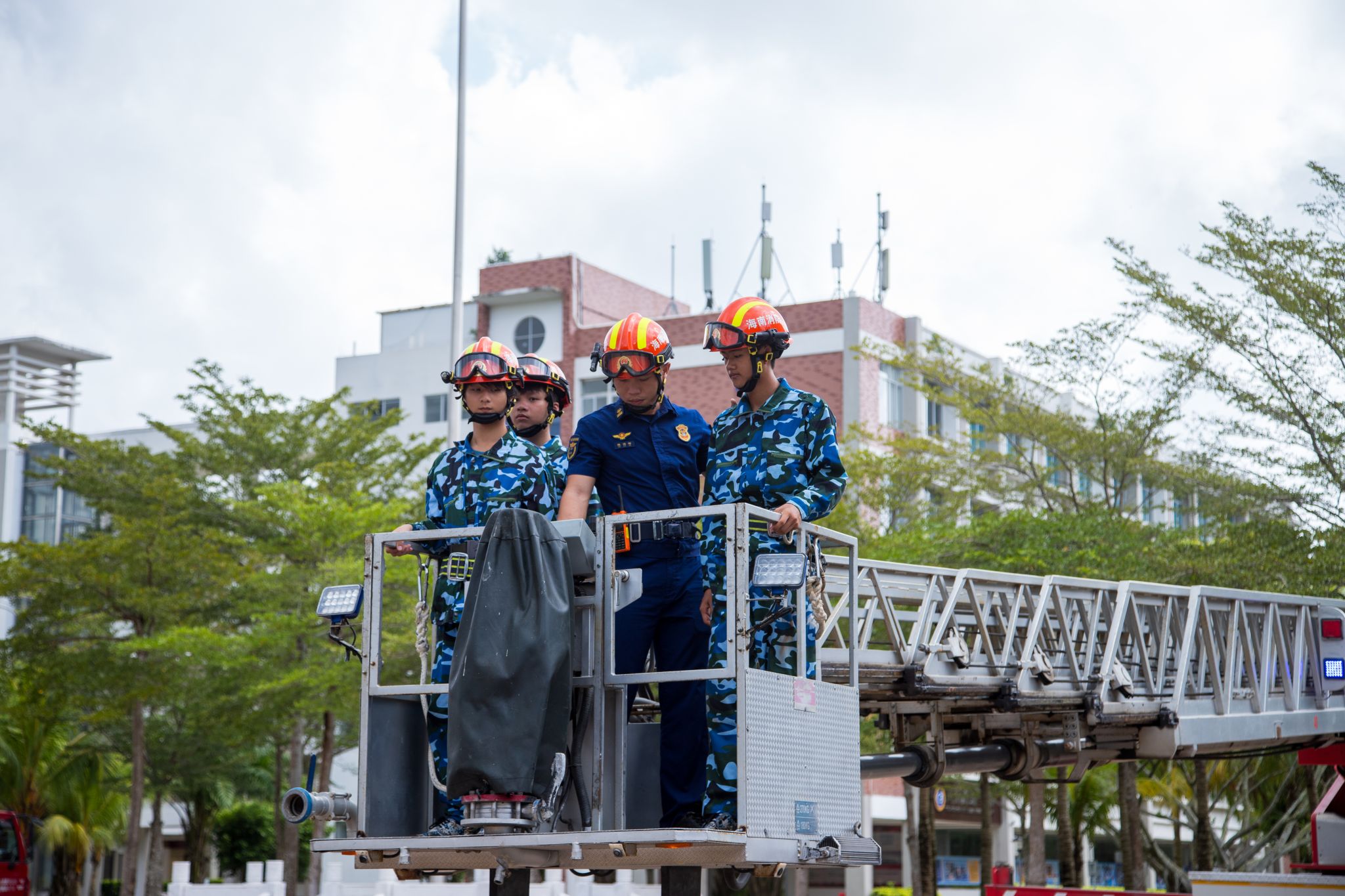 在培训现场,同学们集中观看了《校园消防安全警示片》,学习了宿舍消防安全、电动自行车停放充电规范、火场逃生技巧等关键知识。在一号教学楼,同学们穿越“烟雾逃生”的火灾模拟现场,实地开展应急逃生演练,增强了消防安全意识和应急避险、自救互救能力。消防应急救援站培训团队通过演示“提、拔、握、压”四步灭火法教导新生使用灭火器材,同学们进行现场模拟,掌握了灭火技巧,增强了应对火情的信心。在云梯举高体验环节,同学们近距离了解消防工作,亲身体验高空救援过程。这些互动体验让新生们切身感受到消防工作的艰辛,也提高了对消防安全重要性的认识。