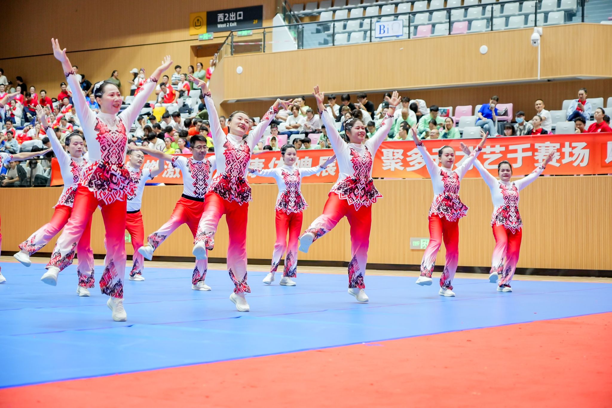 参赛教职工们利用课余和休息时间积极准备,反复打磨动作细节、优化队形编排。比赛现场,伴随着动感激昂的《与时代共舞》,队员们身着统一服装,精神饱满地登场。从整齐划一的肢体动作到富有感染力的面部表情,从紧密配合的队形变换到紧扣主题的舞蹈创意,队员们将对教育事业的热忱与对时代脉搏的感悟融入每一个舞步,生动诠释了《与时代共舞》的主题内涵,展现出海经贸教职工健康向上、团结协作的良好形象,赢得了评委与现场观众的阵阵掌声。