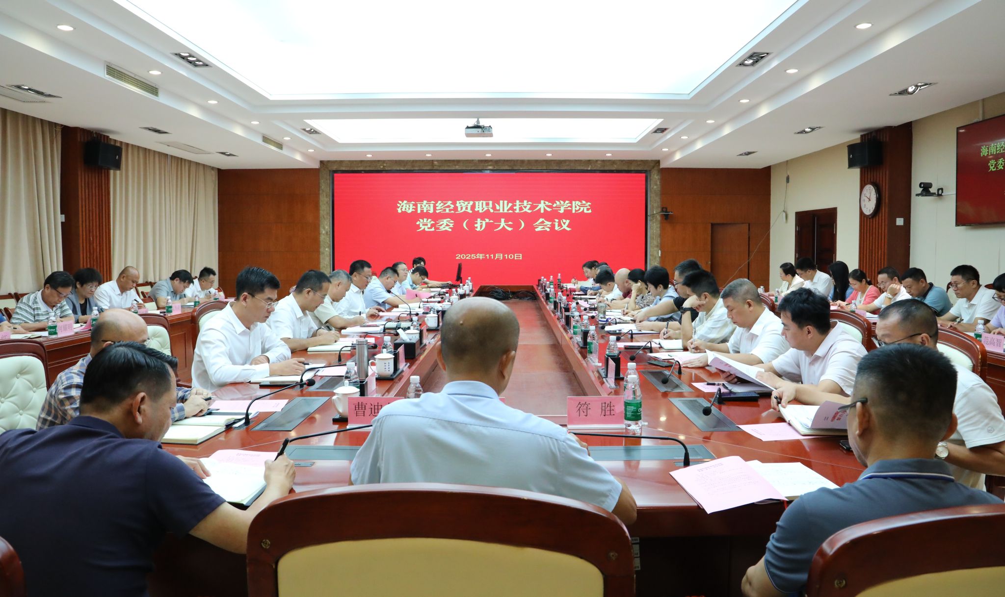2025年11月10日,海经贸职业技术学院召开党委(扩大)会议,学习贯彻习近平总书记在听取海南自由贸易港建设工作汇报时的重要讲话精神,以及省委常委会(扩大)会议精神。学校党委书记王华主持会议,党委班子成员出席会议。