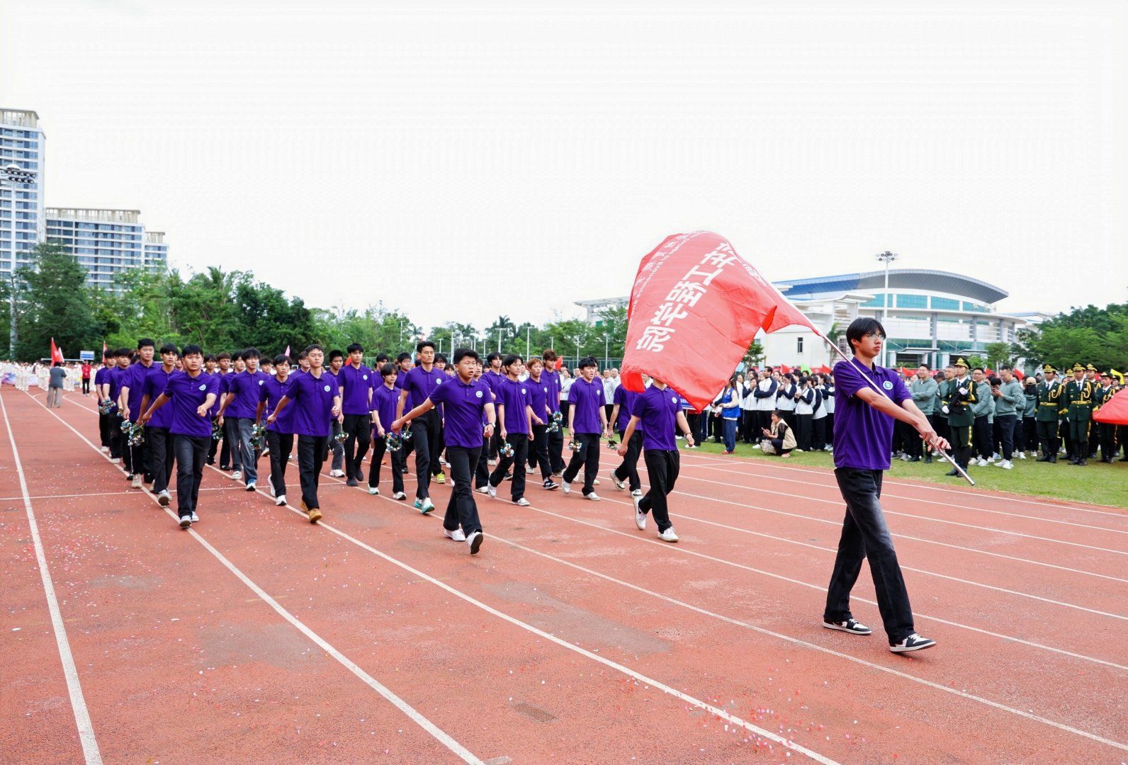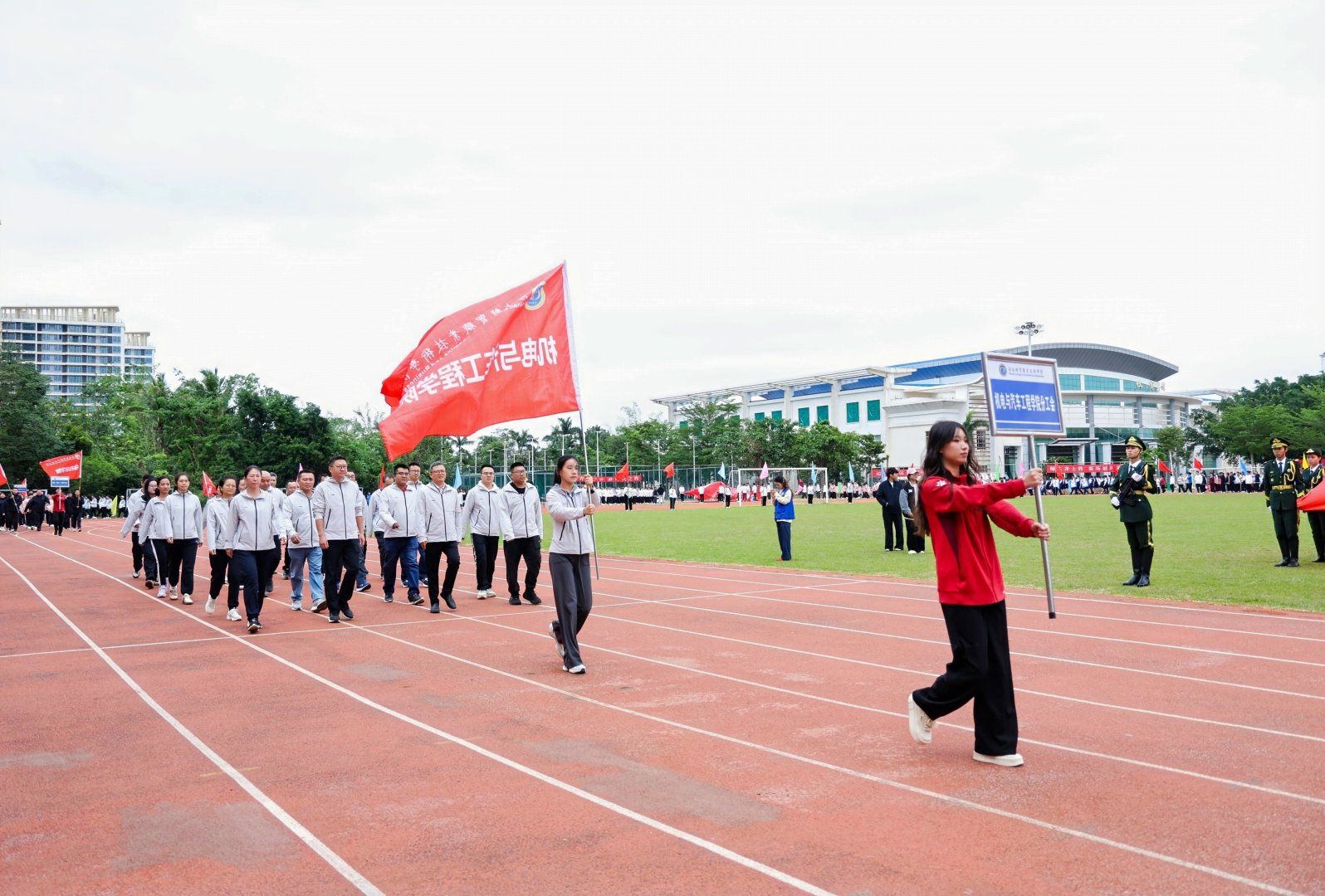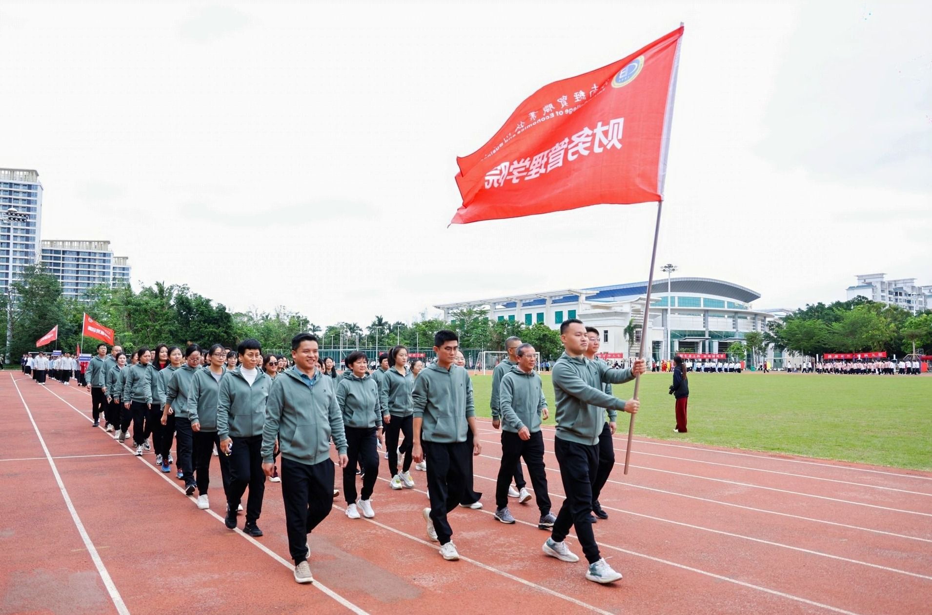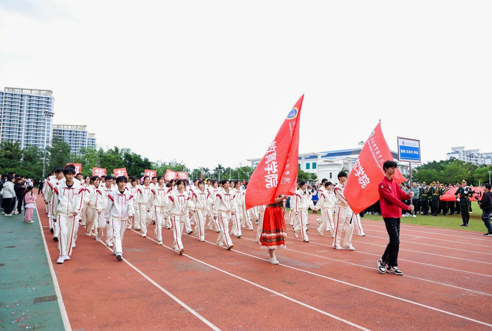 《运动员进行曲》奏响激昂节拍,国旗护卫队、校旗护卫队、彩旗方队、裁判员方队、教职工方队及各二级学院学生运动员方队身着统一服装,意气风发,迈入赛场。整齐的步伐踏响奋进节奏,嘹亮的口号传递青春力量,昂扬的斗志尽显青春担当,展现出海经贸师生奋发向上的昂扬姿态。