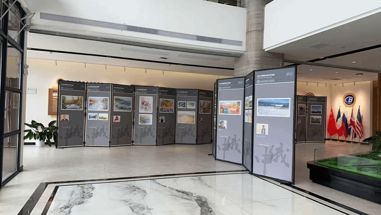 展览现场精心划分了四大特色展区,涵盖风景绘画、原创设计、摄影作品三大品类,让观众沉浸式感受到不同地域、不同群体的艺术风貌。俄罗斯作品区集中呈现了俄方创作者的艺术佳作,尽显俄罗斯艺术的独特美学与人文底蕴;中国作者作品区汇聚国内专业创作者的精品,传递中式艺术的传统韵味与创新表达;中国高校作品区展览各高校学子的优秀创作,展现国内高校艺术教育的丰硕成果。海经贸学生作品区则展现了本校学子的艺术实力,彰显了学校在美育教育方面的扎实成效。四大展区主题鲜明、各具风采,形成了多元互补、交相辉映的艺术格局。