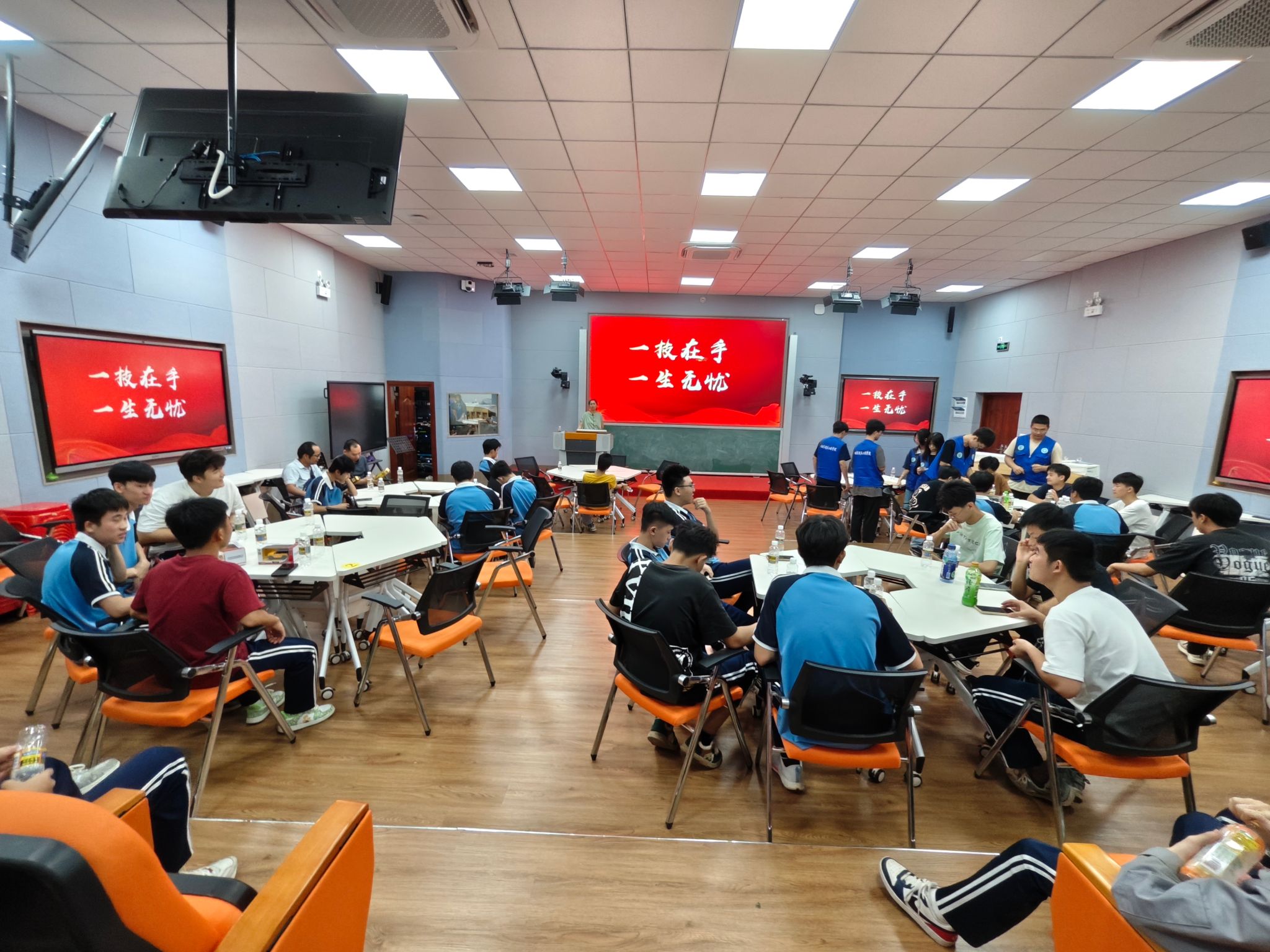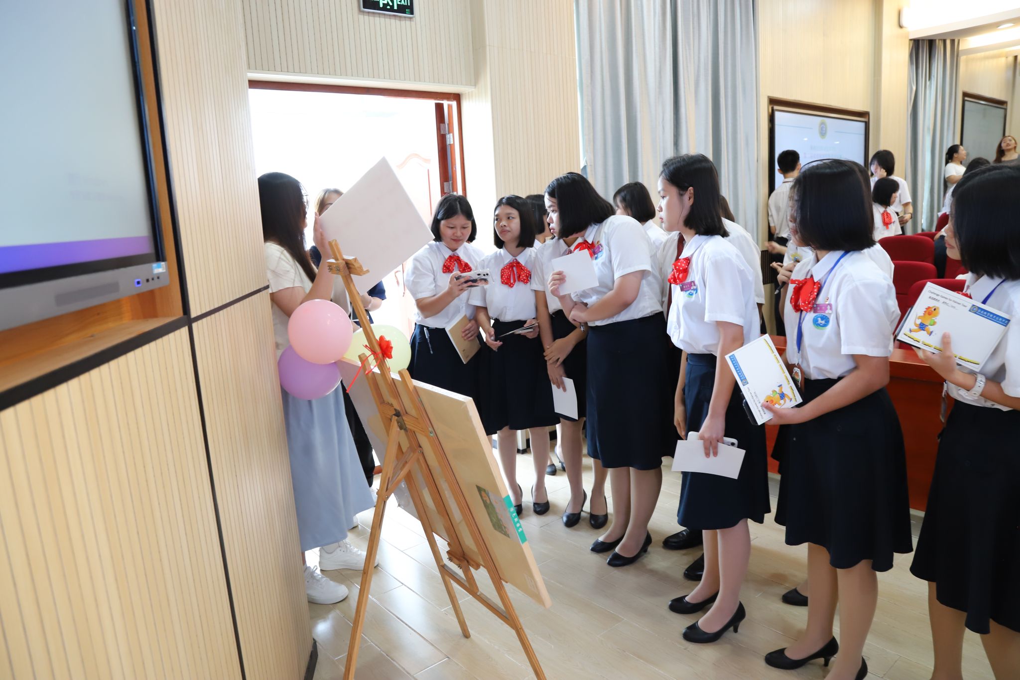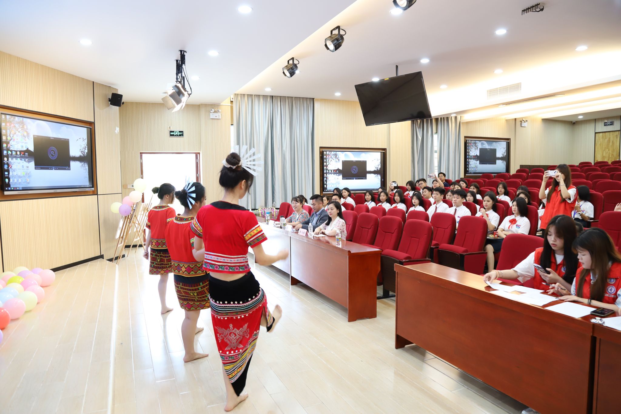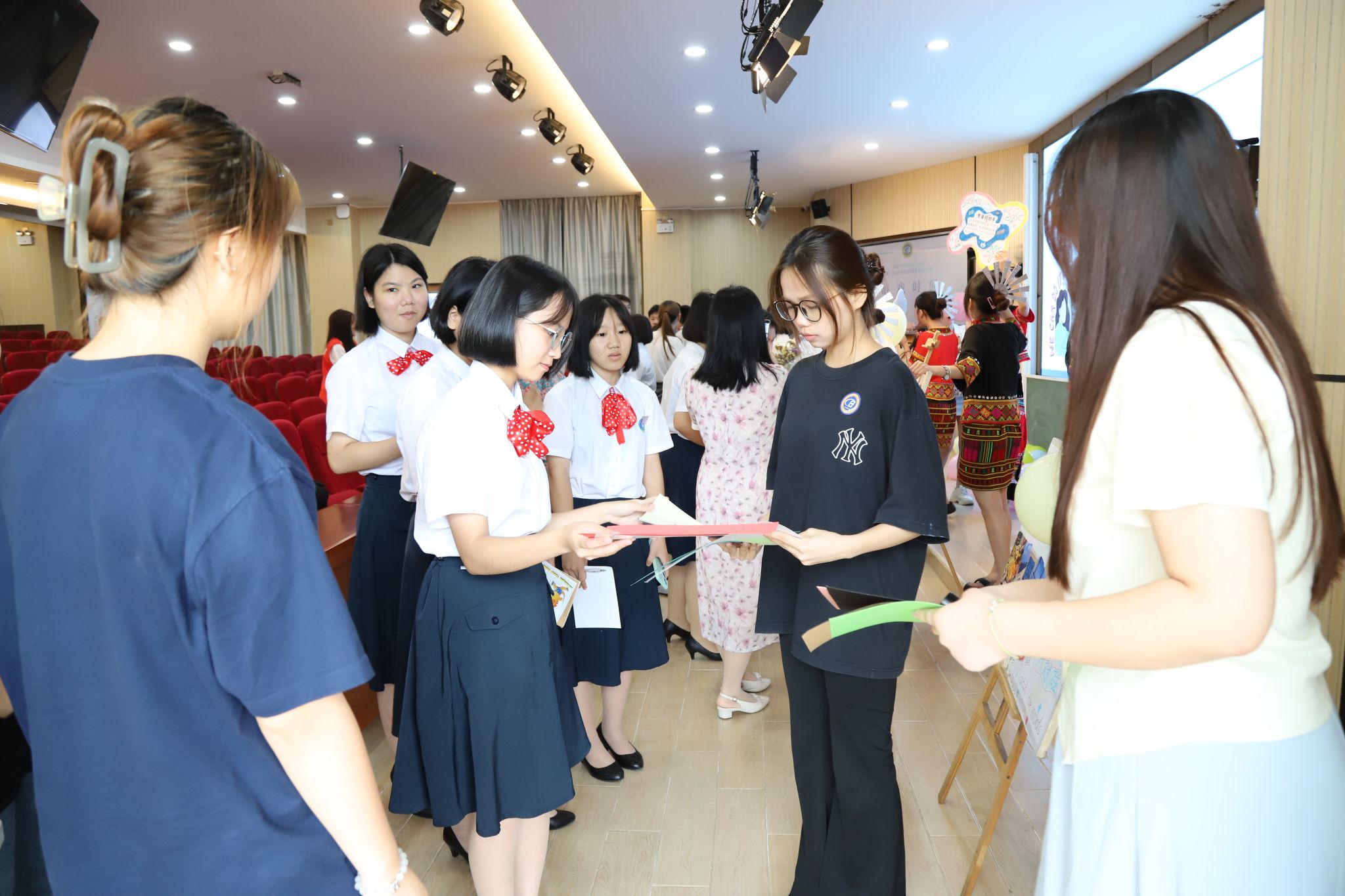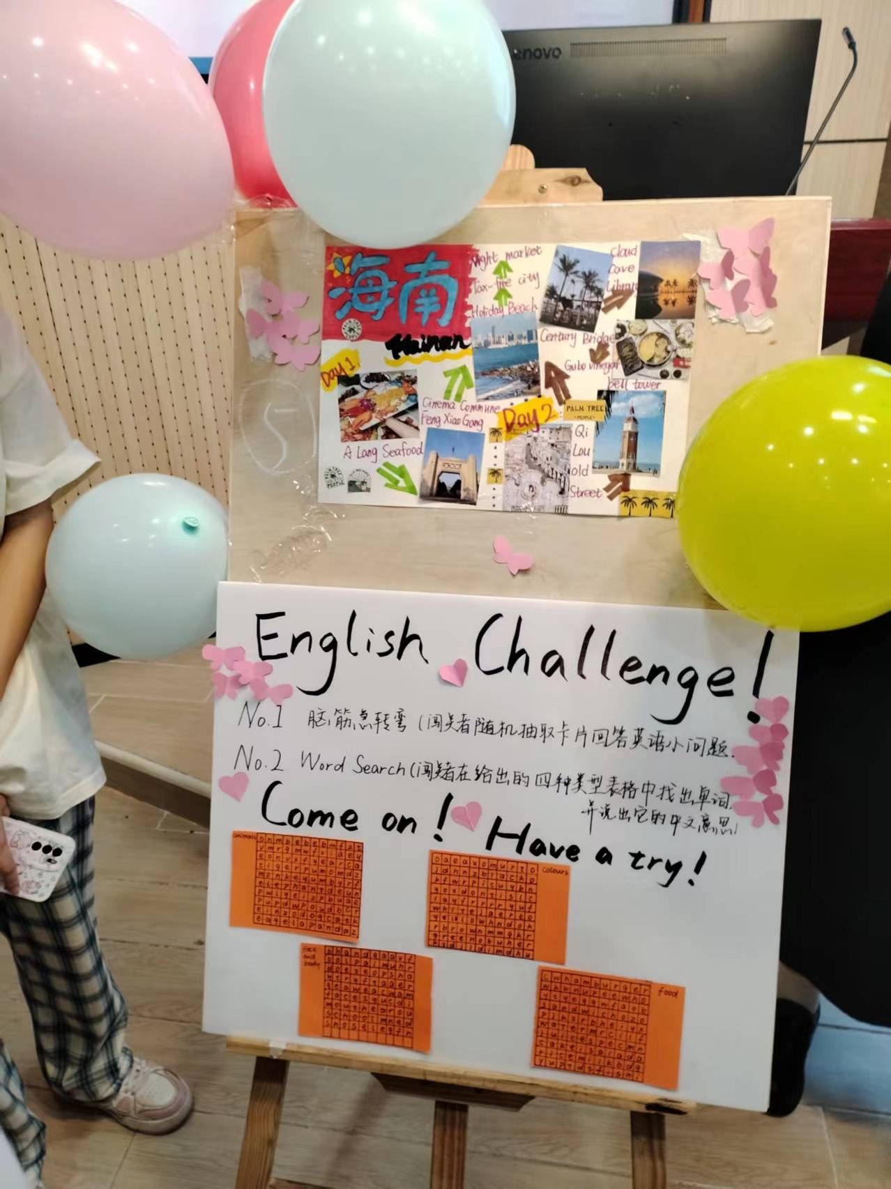国际教育学院的学长学姐们正在进行“双语旅游线路策划竞赛”的比拼,流利的双语表达令人瞩目,载歌载舞的表演带给观众们独特新颖的感官体验。海口旅游职业学校的学弟学妹们也融入到了每个线路策划团队中。大家积极互动,进行游戏和问答闯关,各团队的活动丰富有趣,包括脑筋急转弯、单词对对碰、看图猜民族、单词接龙等游戏。大家参与其中,获取“通关印章”。