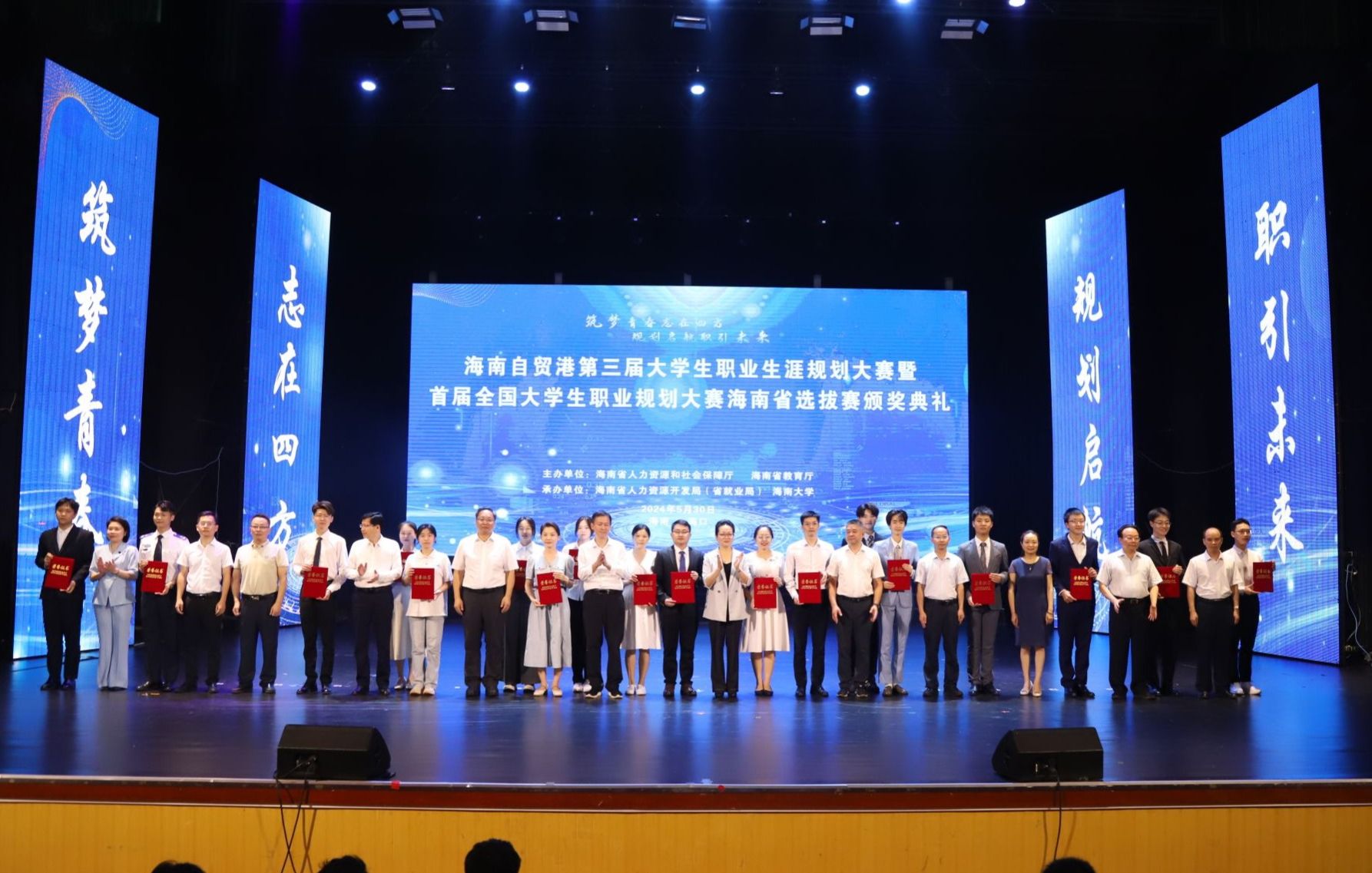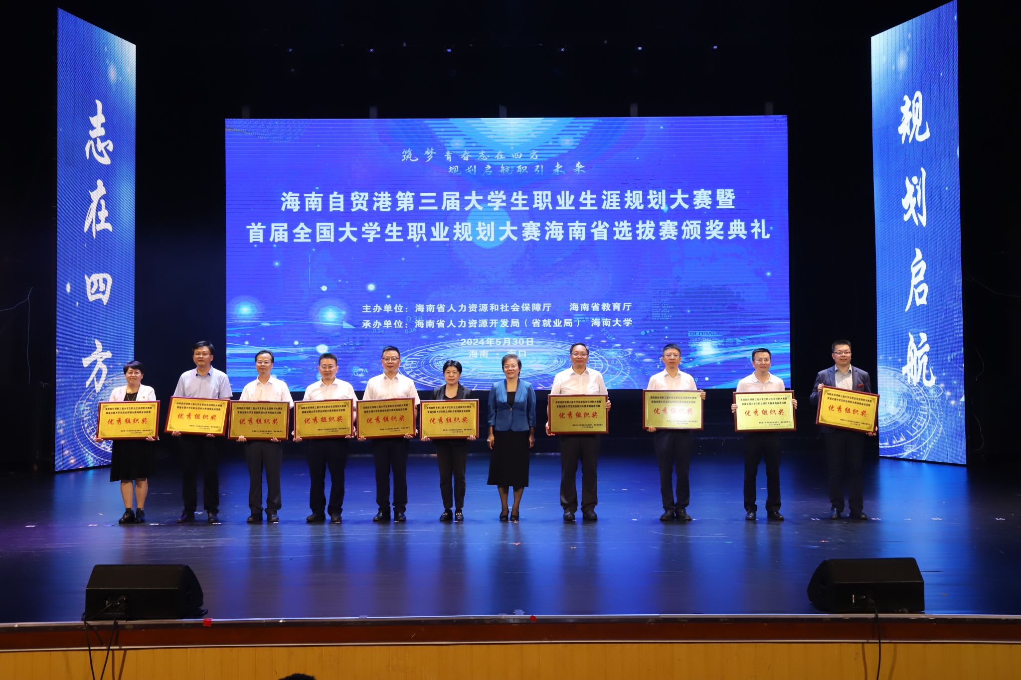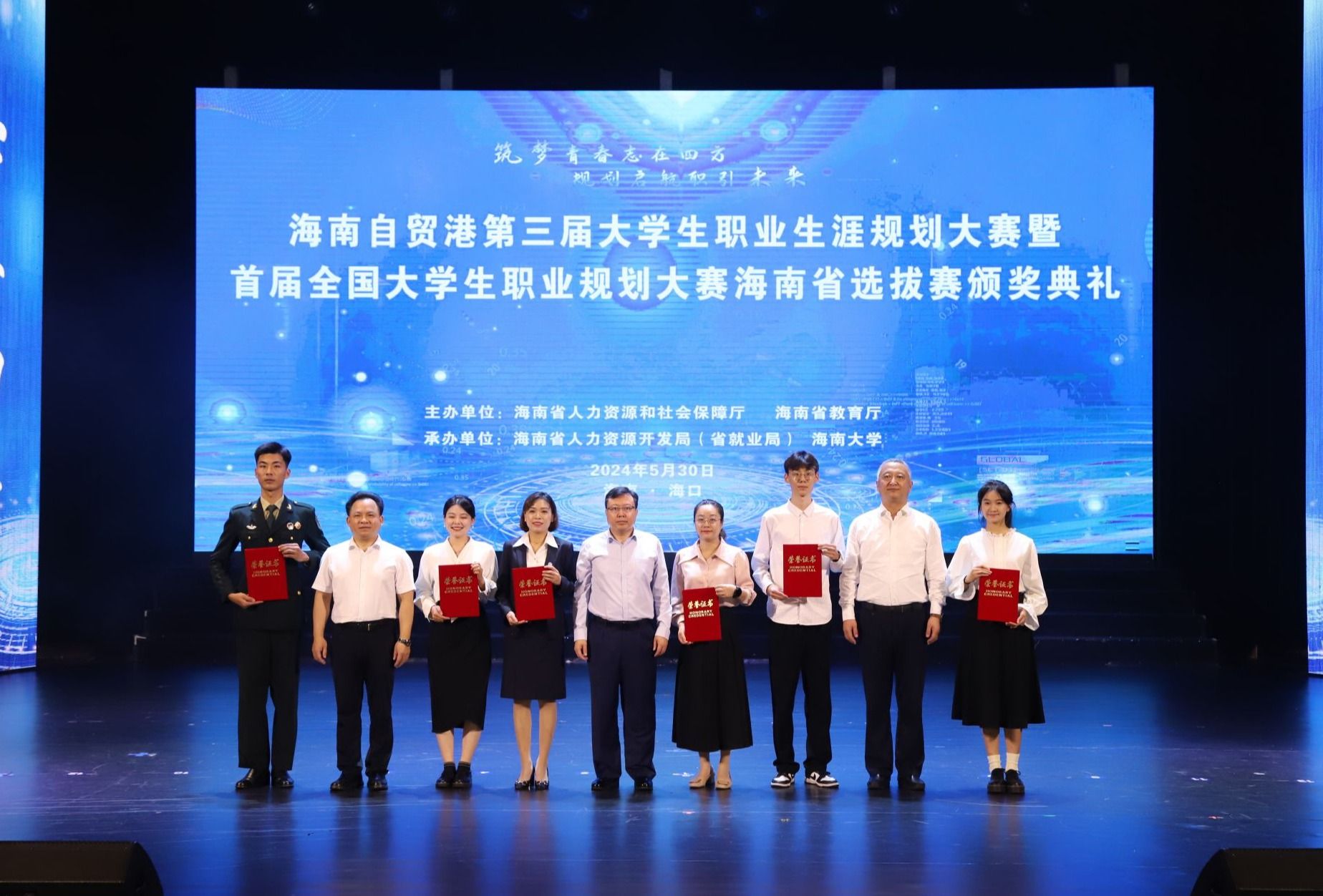 2024年5月30日,海南自贸港第三届大学生职业生涯规划大赛暨首届全国大学生职业规划大赛海南省选拔赛颁奖典礼在海口举行。betway西汉姆联官网参赛师生凭借出色的表现荣获一等奖1项、二等奖1项、三等奖3项、优秀奖4项,李丹、洪冰洁荣获优秀指导教师,betway西汉姆联官网获得“优秀组织奖”。