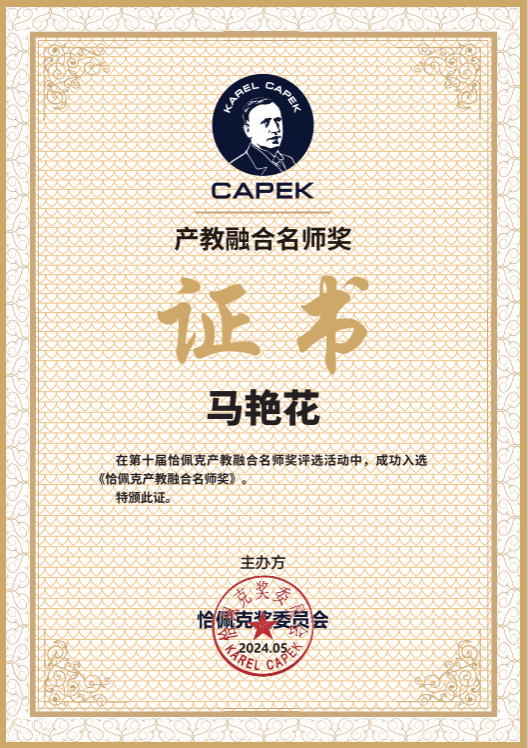 近日,第十四届中国国际机器人高峰论坛暨第十届恰佩克奖颁奖仪式在芜湖举办。betway西汉姆联官网机电与汽车工程学院教师马艳花荣获“产教融合名师奖”。