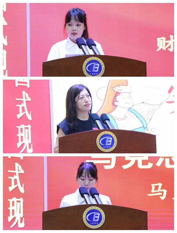 财务管理学院学生陈怡分享了自己参加2023年暑期“三下乡”的经历和收获。国际贸易学院赵爽老师和马克思主义学院陈子佳昆老师作为指导教师发言,分别介绍了自己带领团队参加活动的经验做法。