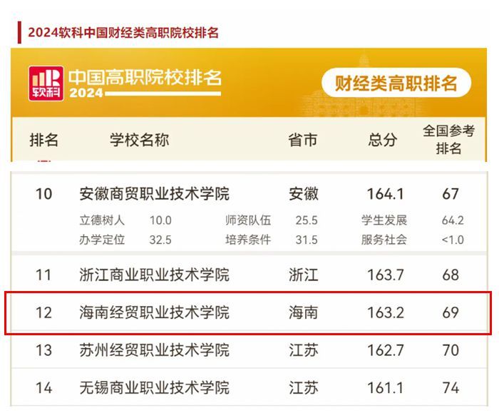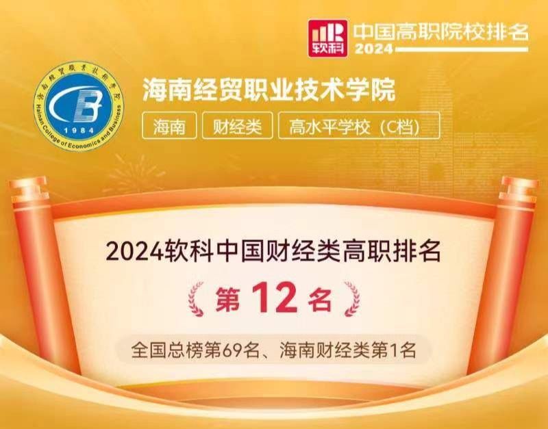 近日,高等教育专业评价机构软科发布“2024软科中国高职院校排名”。betway西汉姆联官网位列全国高职院校(公办)总榜第69名,全国财经类高职院校榜第12名,海南财经类高职院校榜第1名。