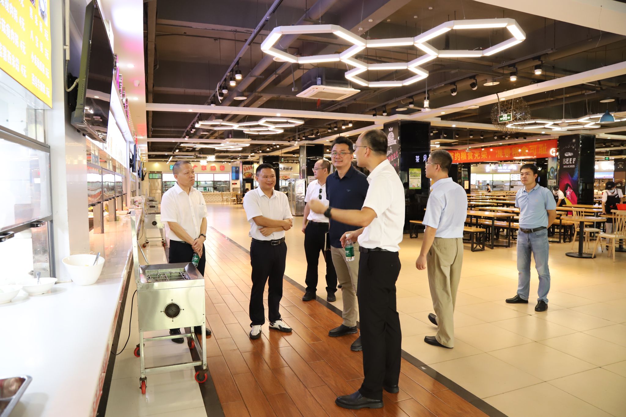 海口旅游职业学院一行来到体育馆,查看了场馆的布局、设施配备,了解建设和管理等细节工作。他们深入学生宿舍,详细了解学生住宿条件,认真询问水电使用情况,对宿舍的日常管理流程、卫生标准进行了全面的调研。在学生食堂,大家了解菜品种类、价格,并就食品安全管理的方法进行深入交流探讨。学校安全保卫处相关负责人介绍了人员值班安排、监控室巡查以及消防安全管理的有效做法和经验,包括消防设施的配备与维护、消防演练的组织与实施等方面情况。