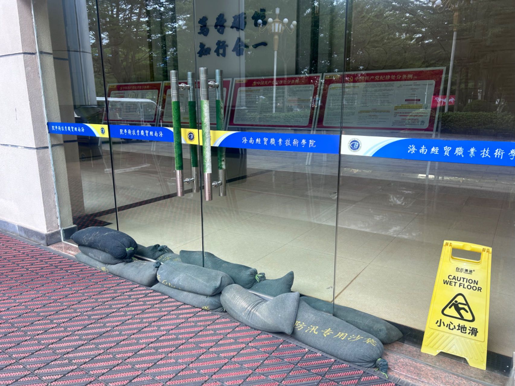 学校立即启动防风防汛应急预案,严格执行24小时值班值守和校领导带班制度。学校党委书记王华,党委副书记、校长崔昌华分头带领相关职能部门到实地检查台风防御工作。各部门各单位对学生宿舍、教学楼、图书馆、体育馆、食堂、施工现场等重点区域开展防风防汛准备工作,清理建筑物雨水管及道路排水管道,确保排水畅通无阻。对树木进行支撑、加固和修剪,检查和加固门窗和高空悬挂物。做好防汛沙袋、药品、雨衣、雨靴、排水泵、强光手电等防汛物资的清点和采购,为每间学生宿舍配备了胶带等物资。提前进行食堂物资采购,切实做好师生员工饮食保障。所有在建工地全部停工,撤离施工人员,并对施工设施采取必要的加固措施。