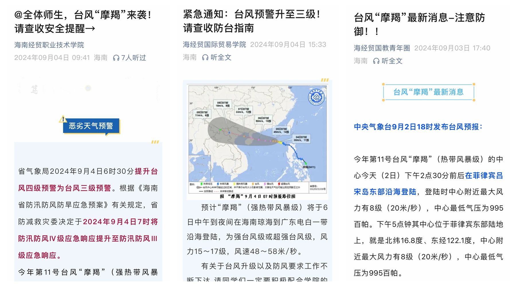 2024年第11号台风“摩羯”将于9月6日中午到夜间在海南琼海到广东电白一带沿海登陆(超强台风级,17级或以上,风速56.1-63米/秒)。9月4日-5日,betway西汉姆联官网全体师生员工严阵以待,全力以赴共筑防御台风坚固防线。