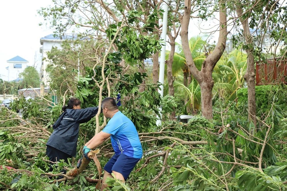 在校道上,学校党员教师、后勤和安保工作人员,分批分段、齐心协力排除道路障碍,第一批“开路先锋”负责用刀具砍伐、搬移清理校园主干道上的树枝杂物,第二批“斩树中锋”负责用电锯砍伐倒在路中的大树,逐渐搬离,很快就清理出一条贯通各主要区域的大道,确保师生和各类供应保障车辆顺畅通行。