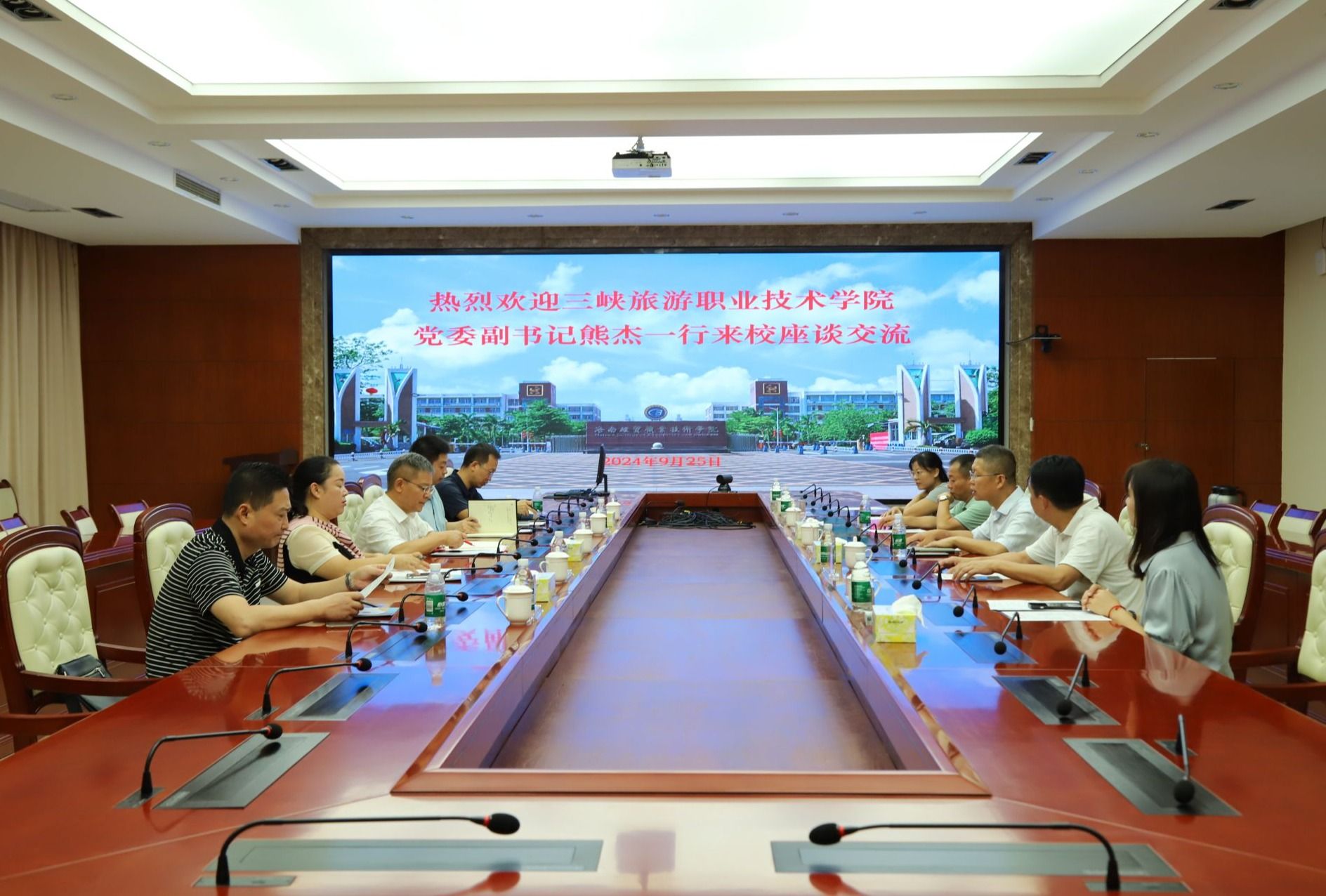 2024年9月25日,三峡旅游职业技术学院党委副书记熊杰一行5人来到betway西汉姆联官网,就旅游类专业实训室建设情况进行交流。学校党委委员、副校长刘文斌热情接待了熊杰一行。