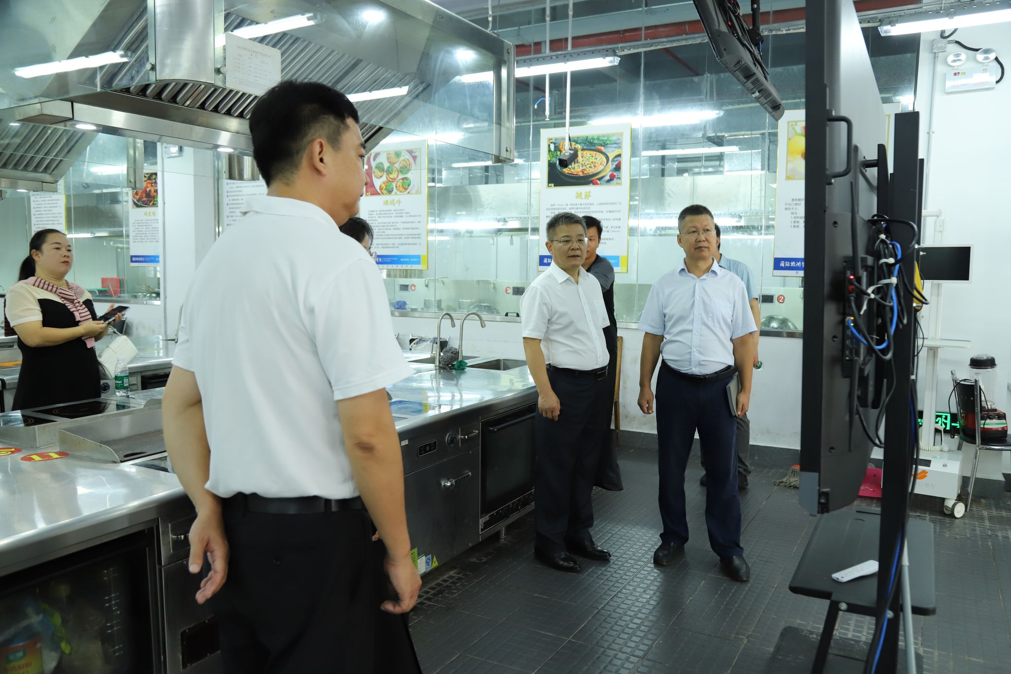 刘文斌陪同熊杰一行参观了免税品营销中心实训室、 VR智能营销实训室、酒店数学营销虚拟仿真实训室、景区运营与管理实训室、酒店模拟经营管理仿真沙盘实训室和烹饪实训室等。