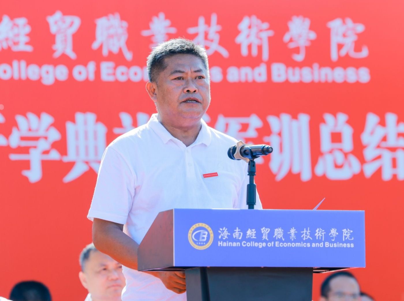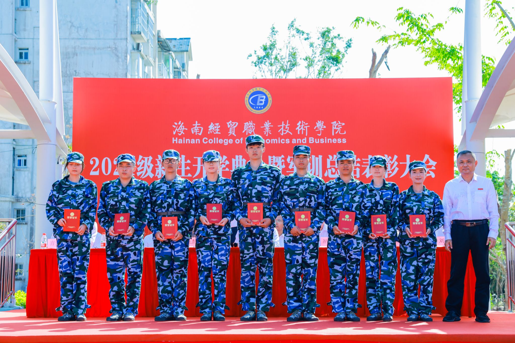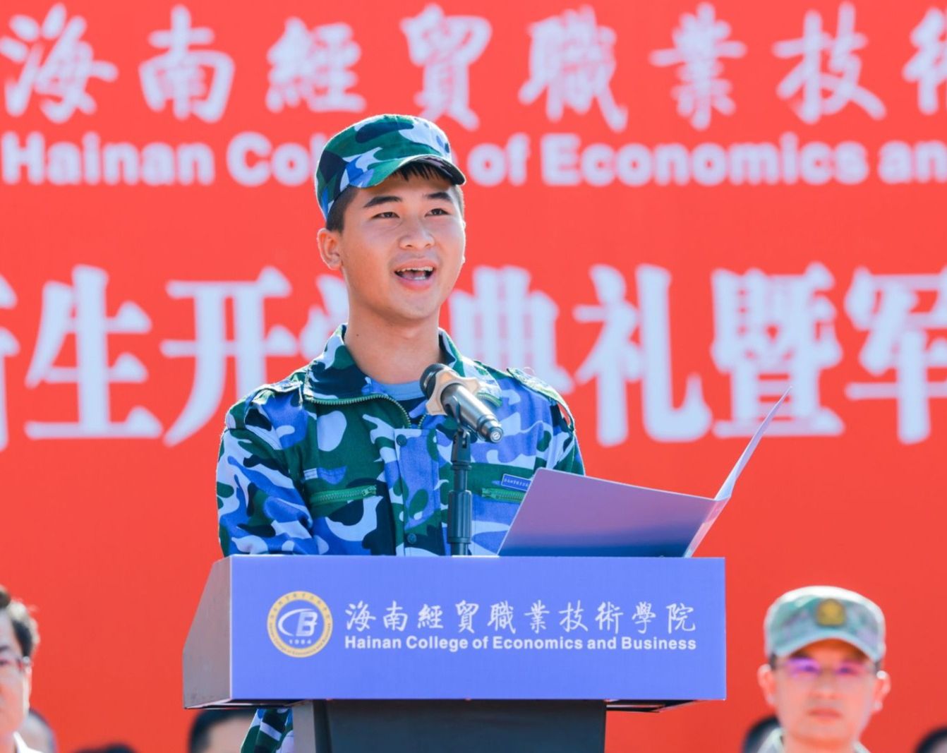 崔昌华向全体新同学表示热烈欢迎,向辛勤付出的承训教官及教职员工致以崇高敬意和诚挚感谢。他说,台风“摩羯”给学校带来了严重破坏,但全体海经贸人众志成城、共克时艰,以团结的意志和坚毅的品格克服重重苦难,实现如期迎新、按时复学,这些精神财富是送给新生们最宝贵的“开学礼物”。他回顾了海经贸的建校历史和近年来取得的成绩,希望同学们把青春的热忱倾注到今天,在蓬勃发展的海经贸堂堂正正地成长成才。他深情寄语新生,一要挺膺担当,立稳报国强国的“鸿鹄志”。牢固树立起为祖国、为人民奋斗奉献的崇高志向,让青春年华在中华民族伟大复兴的新征程上焕发更加绚丽的光彩。二要拥抱理想,敢做仰望星空的“追梦人”。不自我怀疑、不轻易言弃,相信“相信”的力量,在追逐梦想的过程中,发现人生最美的风景。三要追求卓越,当好脚踏实地的“奋斗者”。保持独立思考,扎稳立身立业之根,练就过硬本领,为未来的发展创造更大空间。四要砥砺身心,成为全面发展的“栋梁材”。明天是中华人民共和国七十五周年华诞,我们要感谢先辈们创造的美好生活,增强忧患意识,提高政治觉悟,继续发扬军训培塑起来的良好作风,真正成为德智体美劳全面发展的社会主义建设者和接班人。