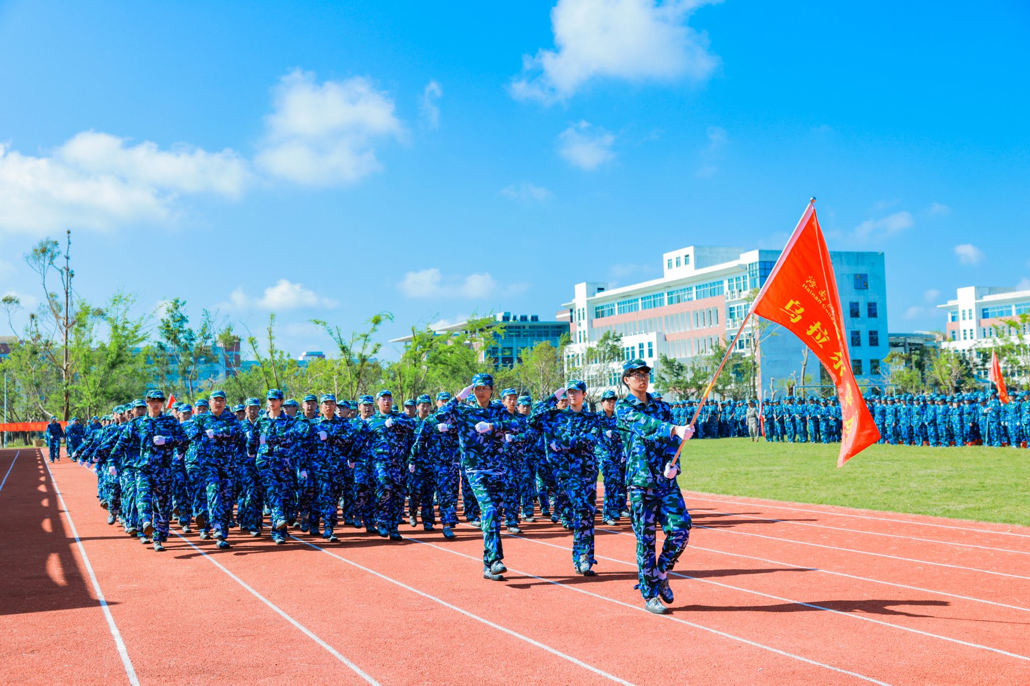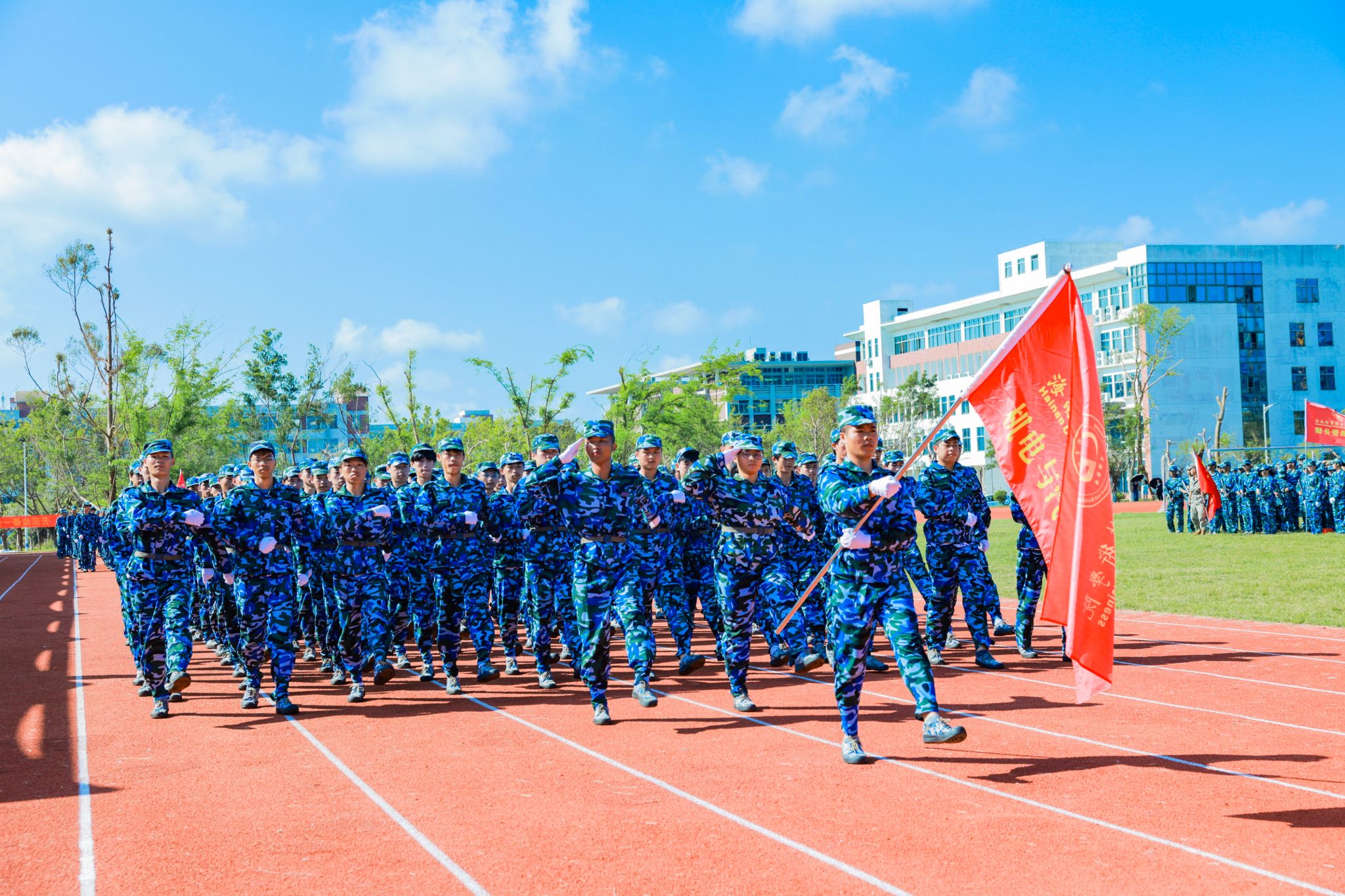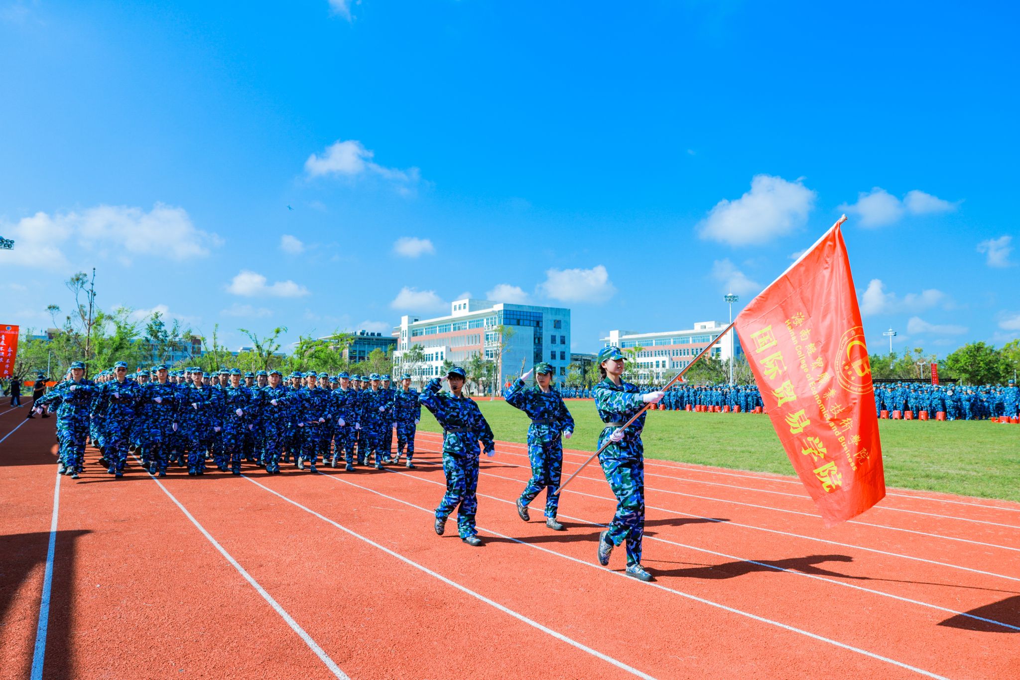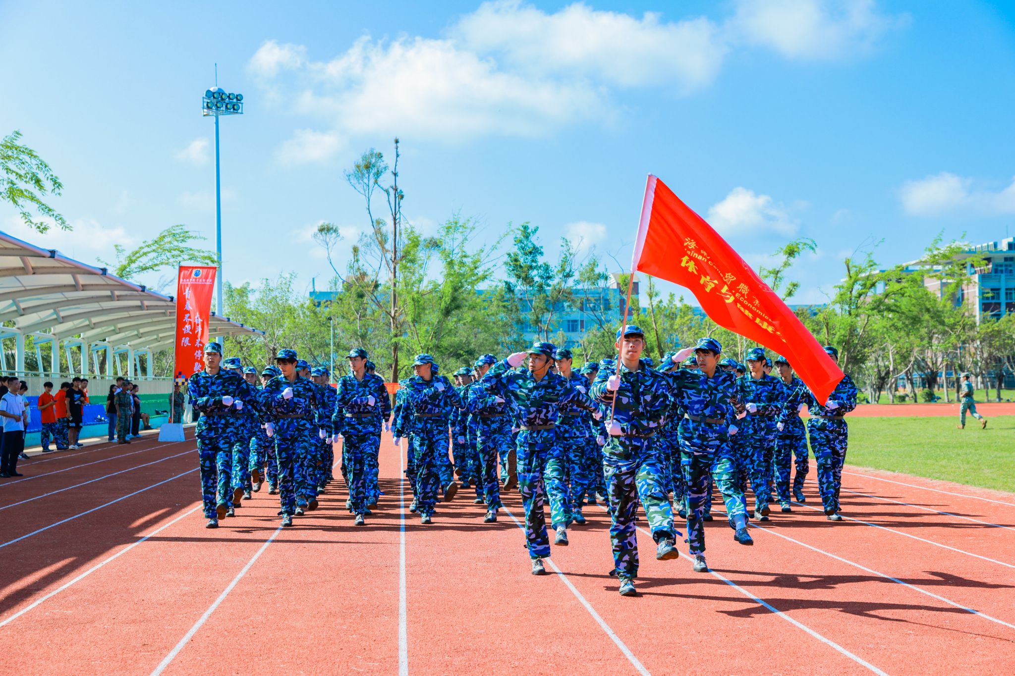 口号激昂,军歌嘹亮,回荡在操场的每一个角落。来自9个二级学院的新生代表方队英姿勃发、步履铿锵,依次昂首阔步经过主席台,充分展现了海经贸学子充满活力的青春风采。在这一刻,他们以优异的表现,向全体师生和教官递交了一份满意的答卷。