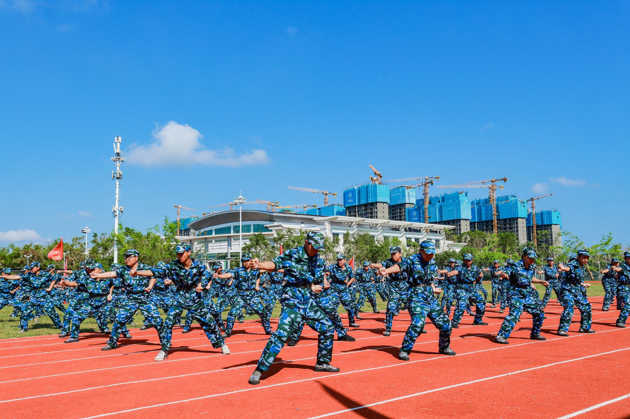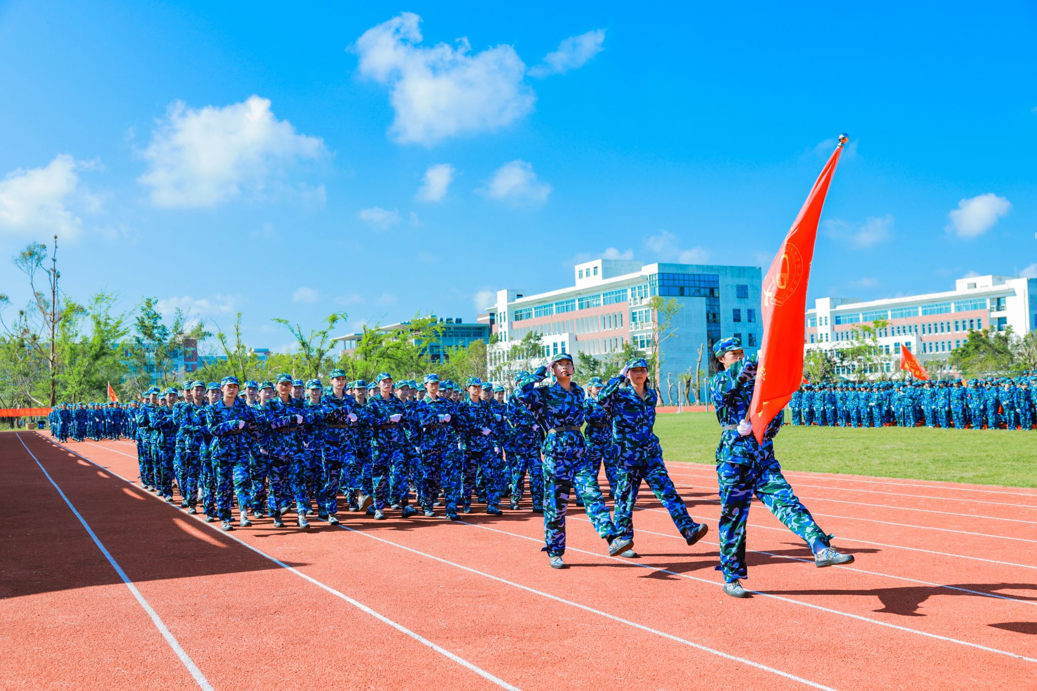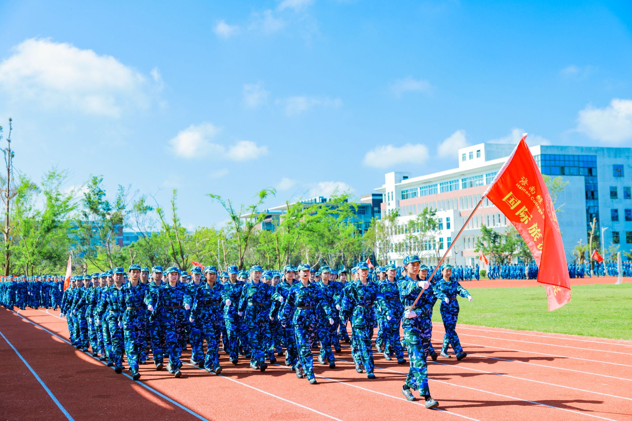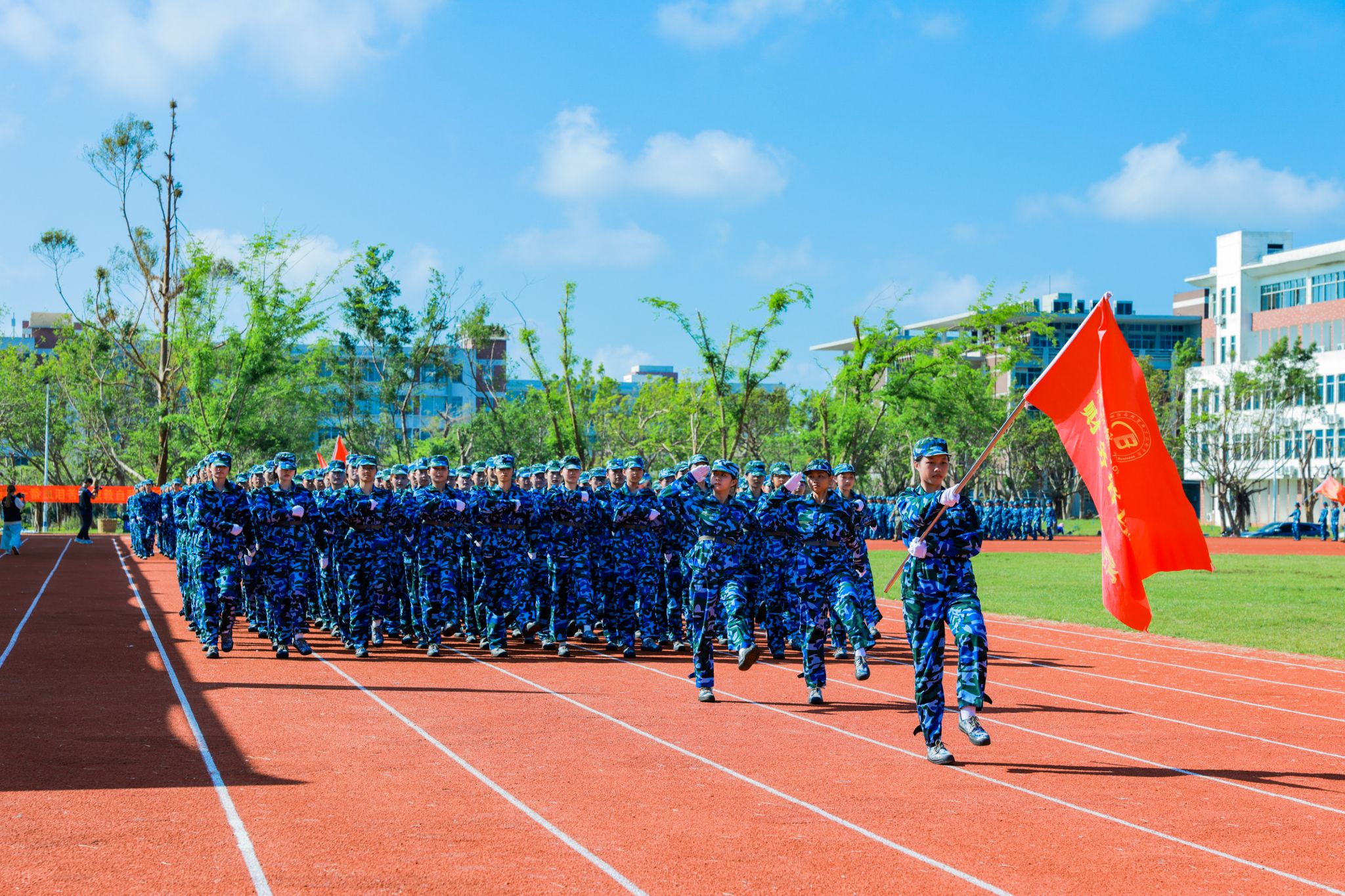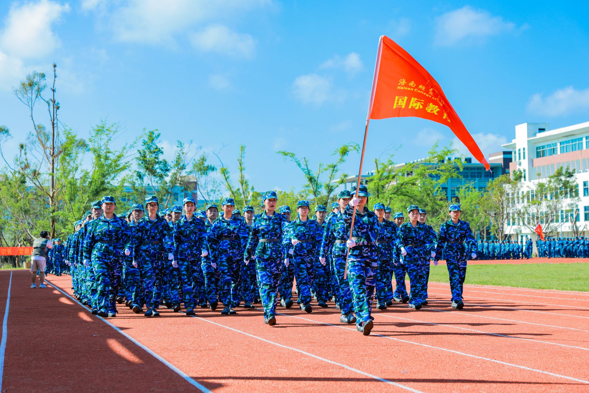 口号激昂,军歌嘹亮,回荡在操场的每一个角落。来自9个二级学院的新生代表方队英姿勃发、步履铿锵,依次昂首阔步经过主席台,充分展现了海经贸学子充满活力的青春风采。在这一刻,他们以优异的表现,向全体师生和教官递交了一份满意的答卷。
