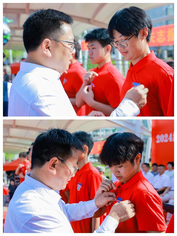 王华、崔昌华为新生代表佩戴学校徽章