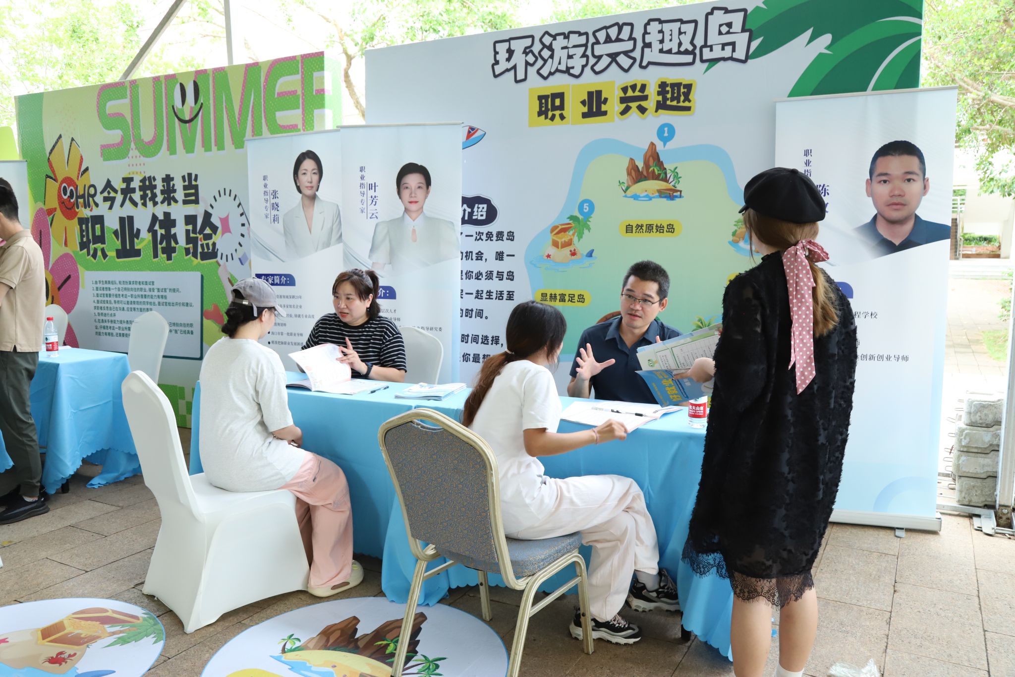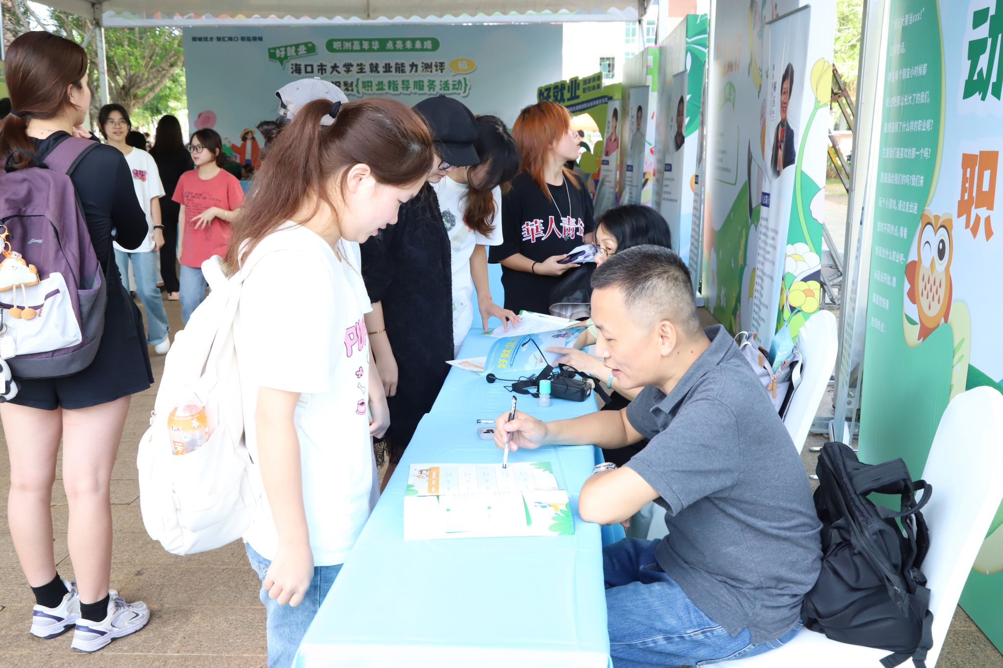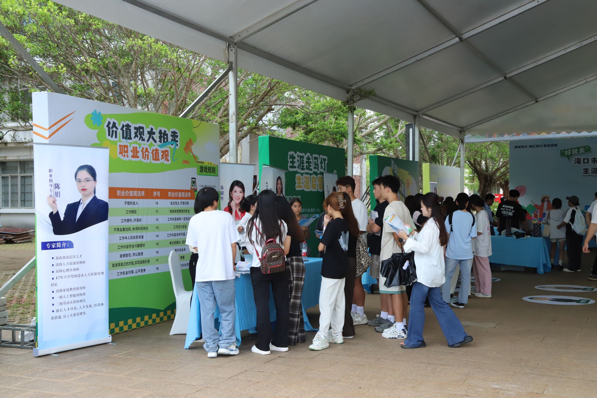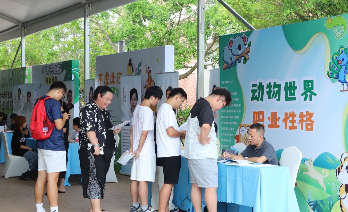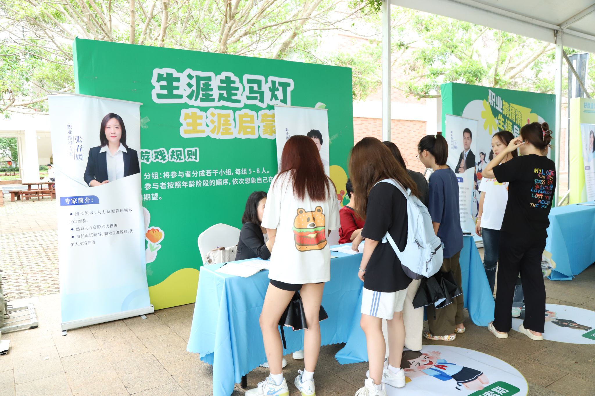 在经贸广场前,由中共海口市委人才发展局主办、betway西汉姆联官网等单位承办的海口市大学生就业能力测评和生涯规划活动也在火热进行中。“生涯走马灯”“兴趣职业对对碰”“绘制我的职业蓝图”……前来参加招聘会的同学纷纷沉浸式参与互动体验,在活动中完成自我探索、职业目标探索和生涯愿景展望。充满趣味的测评活动帮助同学们梳理生涯规划思路,构建职业发展体系,明确自身需要提升的能力和素质,有针对性地进行学习和实践,从而提高就业竞争力。