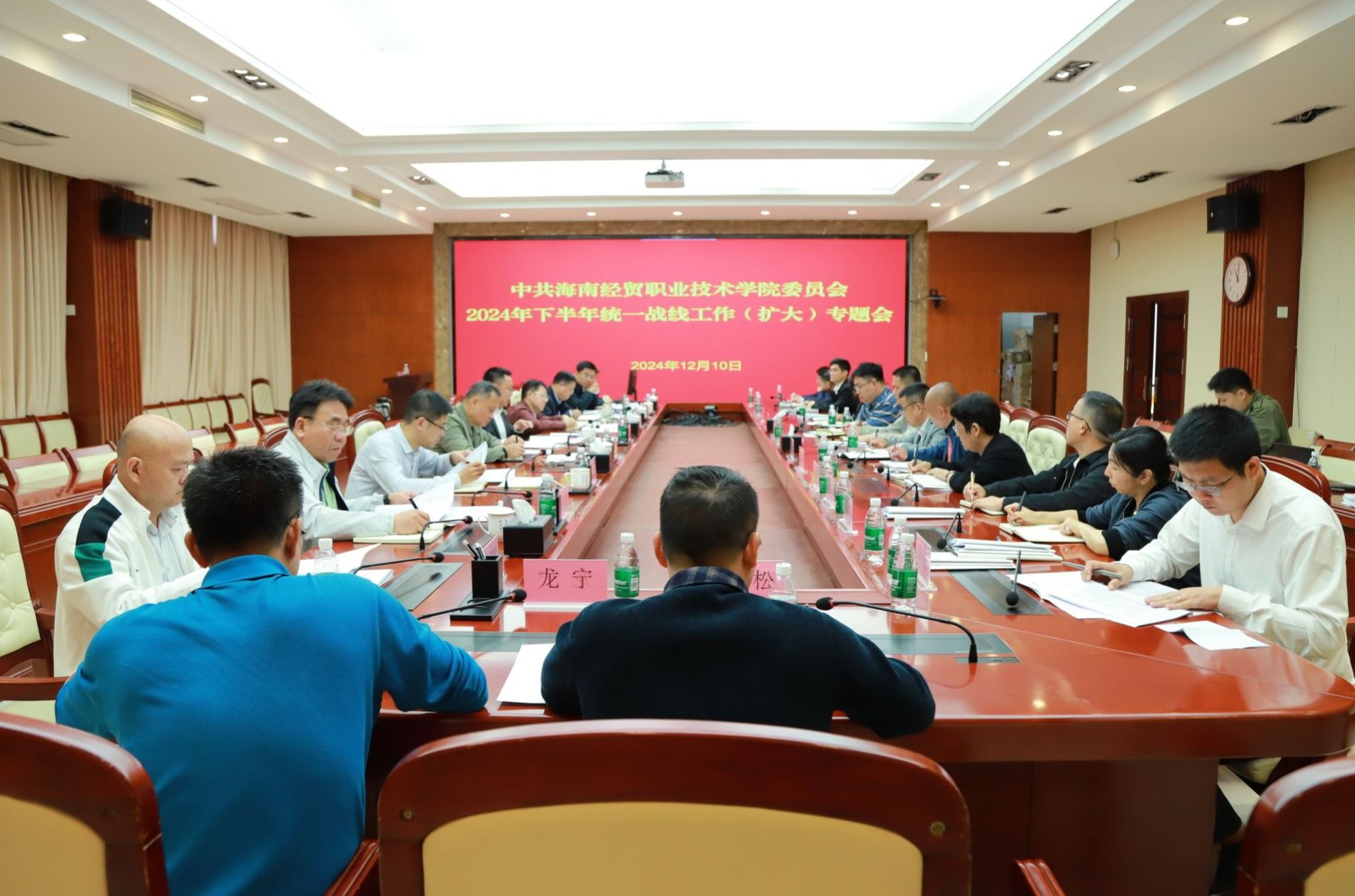 王华传达学习习近平总书记在中央统战工作会议上的重要讲话精神、海南省委省政府关于做好党的宗教工作的有关文件精神。田小林领学《中国共产党统一战线工作条例》。方天海作2024年学校统一战线工作情况汇报。