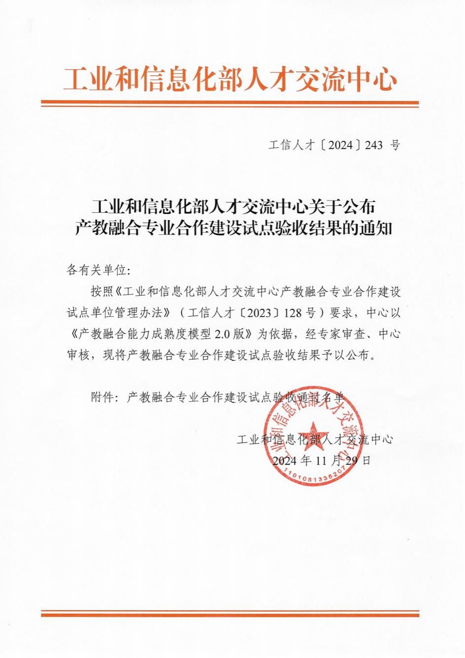 试点建设周期为2年,工业和信息化部人才交流中心按照《工业和信息化部人才交流中心产教融合专业合作建设试点单位管理办法》,以《产教融合能力成熟度模型2.0版》为依据,经专家审查、中心审核,于2024年11月公布了111所学校有关专业的验收结果,其中18所本科学校、72所高职学校、19所中职学校、2所技工学校通过验收。海经贸是海南唯一入选并顺利通过验收的高职院校。