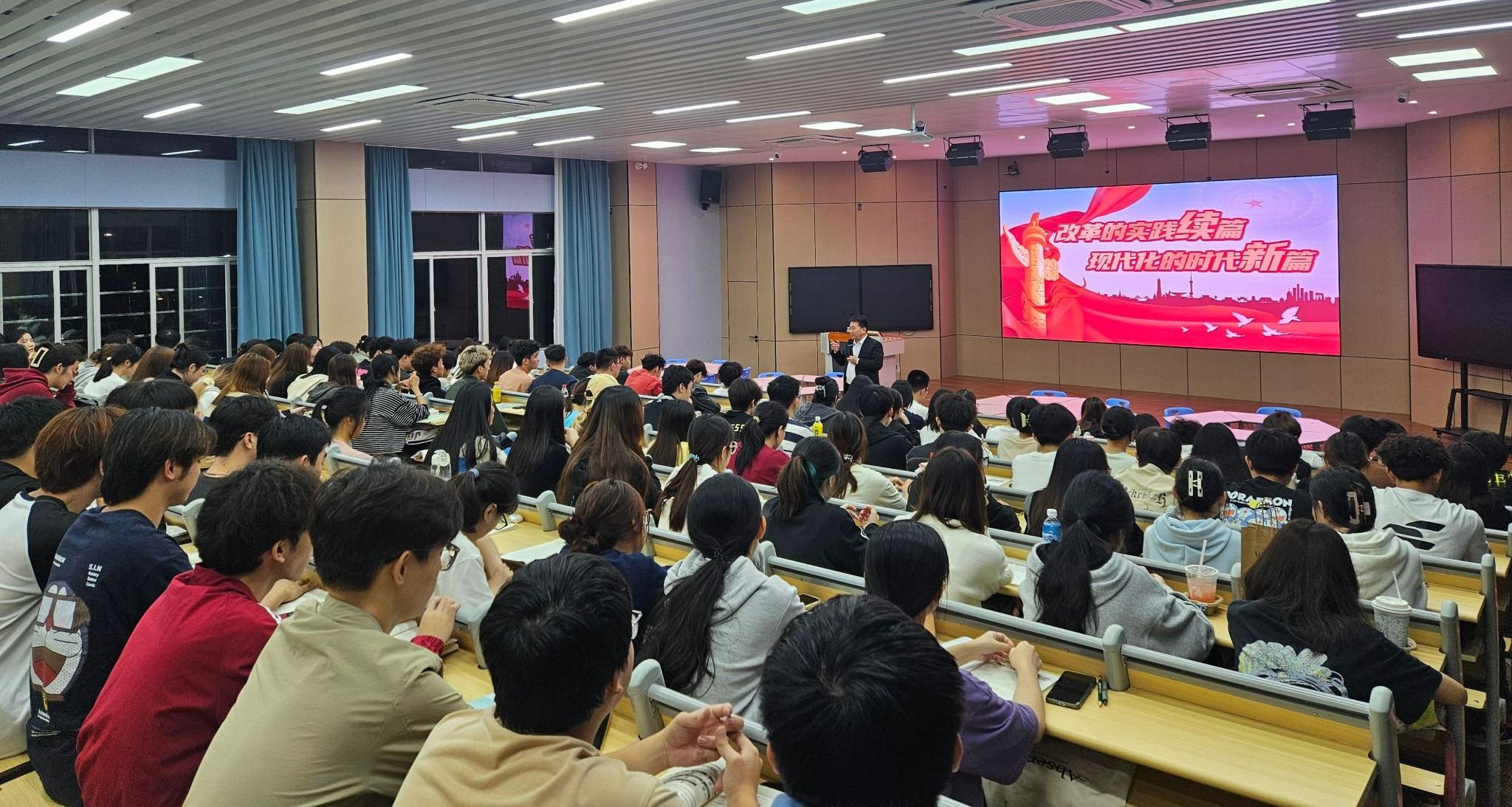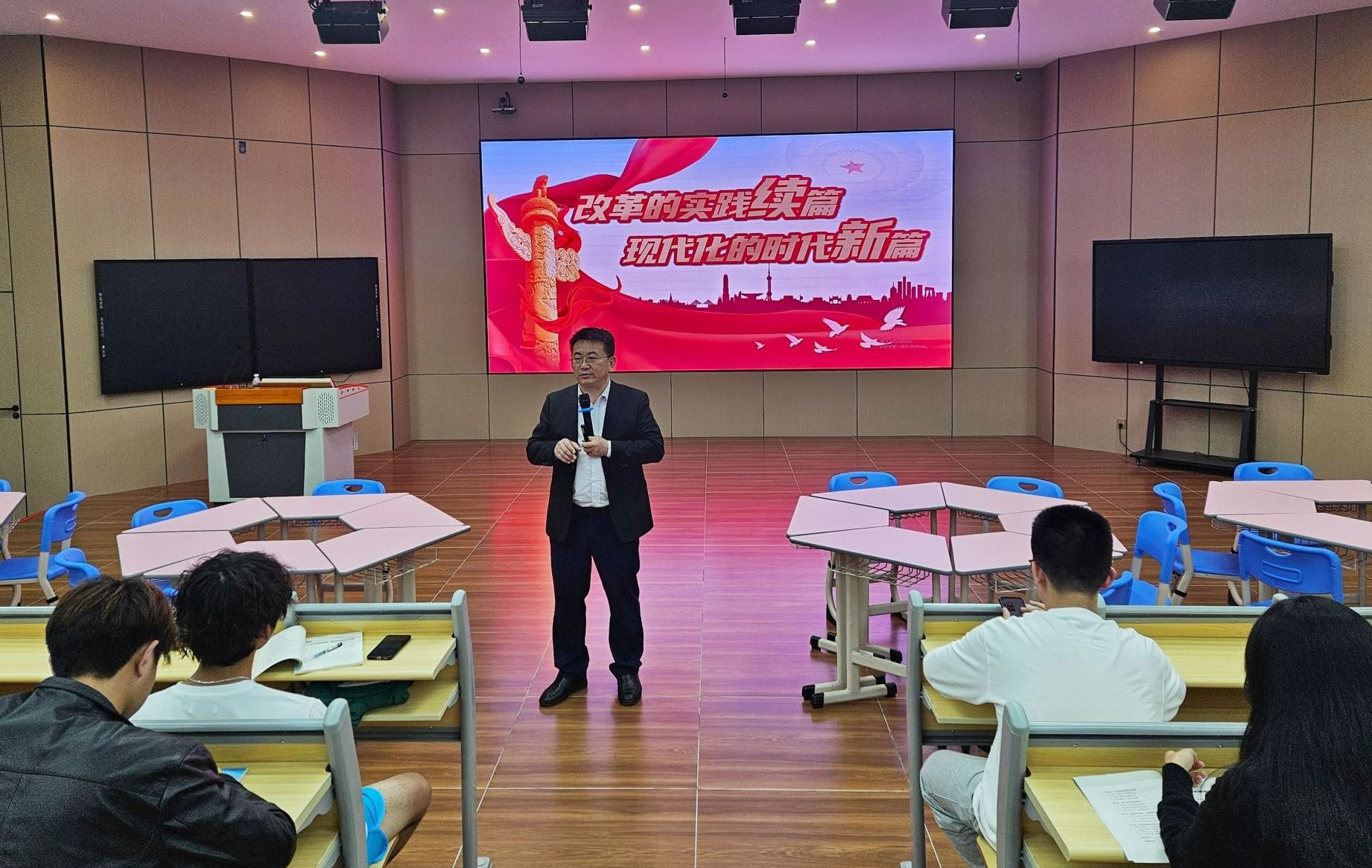 崔昌华围绕“改革的实践续篇 现代化的时代新篇”主题,为同学们讲授思政课。他分析国际形势和社会主要矛盾变化,展示了党的十八大以来取得的历史性成就和发生的历史性变革,阐述新时代进一步全面深化改革的重大举措,以独特视角和亲身经历,结合自身思考与学校实践,激发同学们对未来发展和个人成长的积极思考。“新时代青年大学生,是国家事业发展的‘顶梁柱’和‘承重墙’。同学们要紧跟党中央的步伐,以实际行动和优异成绩书写助力中国式现代化的青春答卷!”