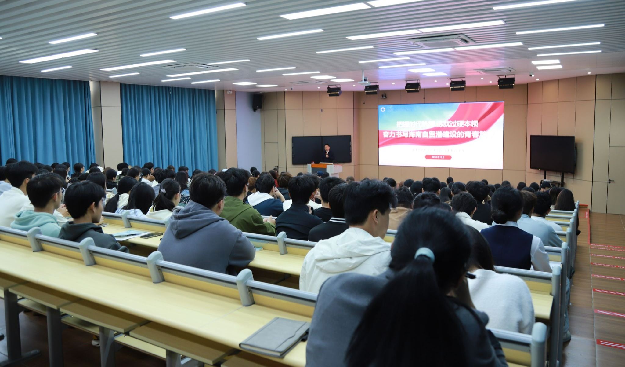 陈修焕、符史杭、田小林、方天海分别围绕“七十五载迎盛世 砥砺前行续华章”“下好区域协调发展这盘棋”等主题,从国家、学校、个人的角度进行阐述和讲解,激励同学们在服务社会、奉献国家的奋斗历程中实现自己的人生价值,为海南自由贸易港建设作出应有贡献,做堪当强国建设、民族复兴重任的合格建设者和可靠接班人。